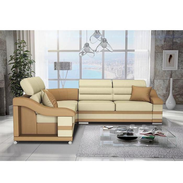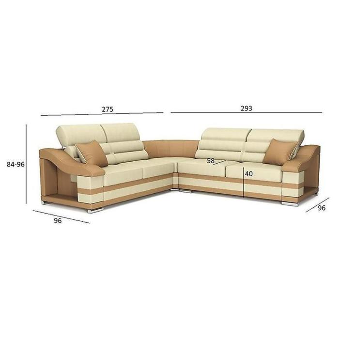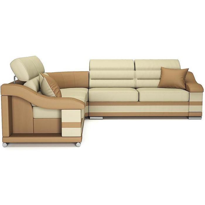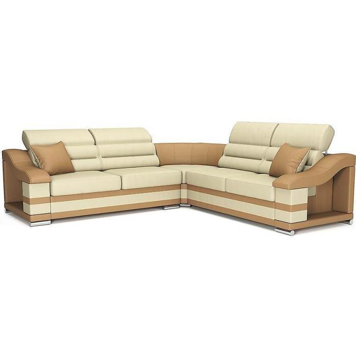 Tapicerka wykonana jest ekoskórą. Lekko profilowane oparcie, ruchome zagłówki i podłokietniki poprawią jakość wypoczynku. Małe ozdobne poduszki oraz dwukolorowe wstawki świetnie współgrają z całą konstrukcją nadając jej nietuzinkowego charakteru. Kanapa narożna Hamilton to doskonały wybór do Twojego salonu!