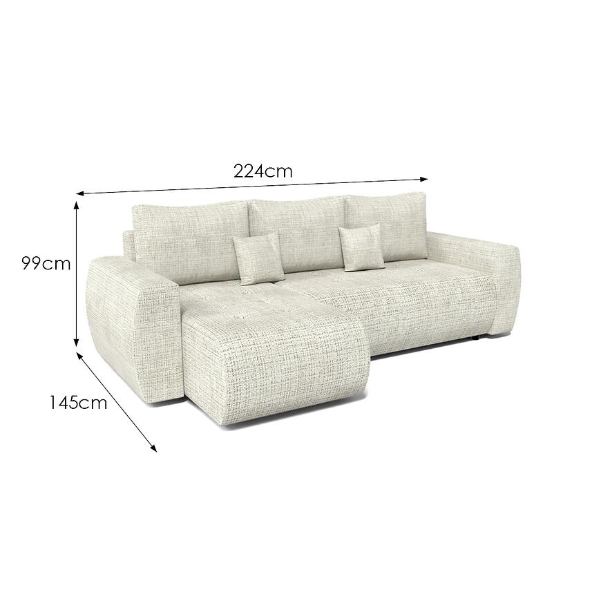 Siedzisko narożnika wykonano z połączenia sprężyny falistej oraz pianki, co zapewnia odpowiednie podparcie ciała i wysoki komfort siedzenia oraz spania. Tkanina tapicerska jest przyjemna w dotyku i dobrze prezentuje się na co dzień. Wysokość 99 cm, szerokość 224 cm oraz głębokość 145 cm sprawiają, że jest to narożnik zaliczany do kategorii narożników małych, idealnych do mieszkań w blokach lub mniejszych domów.