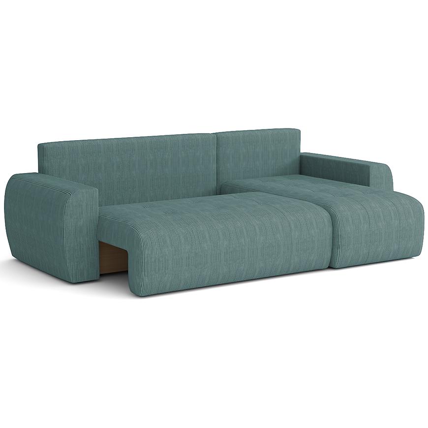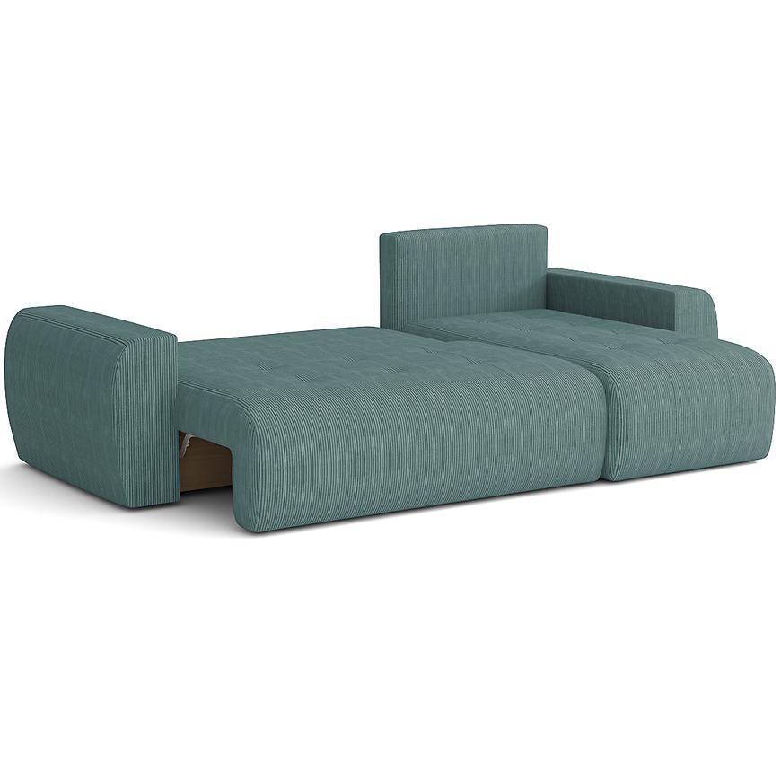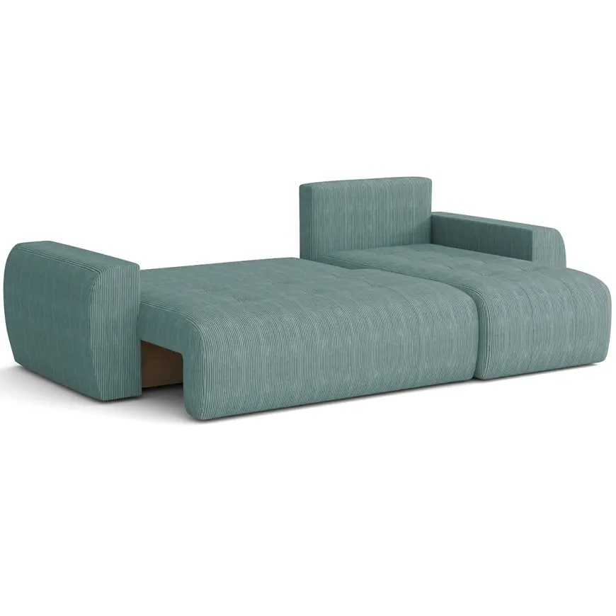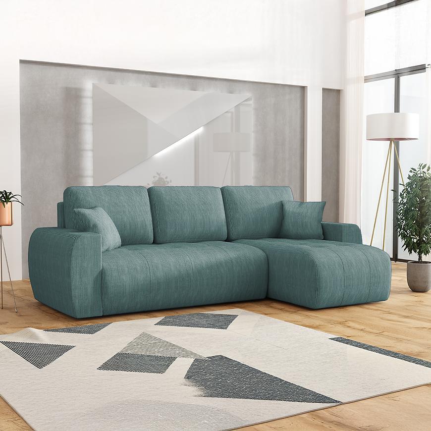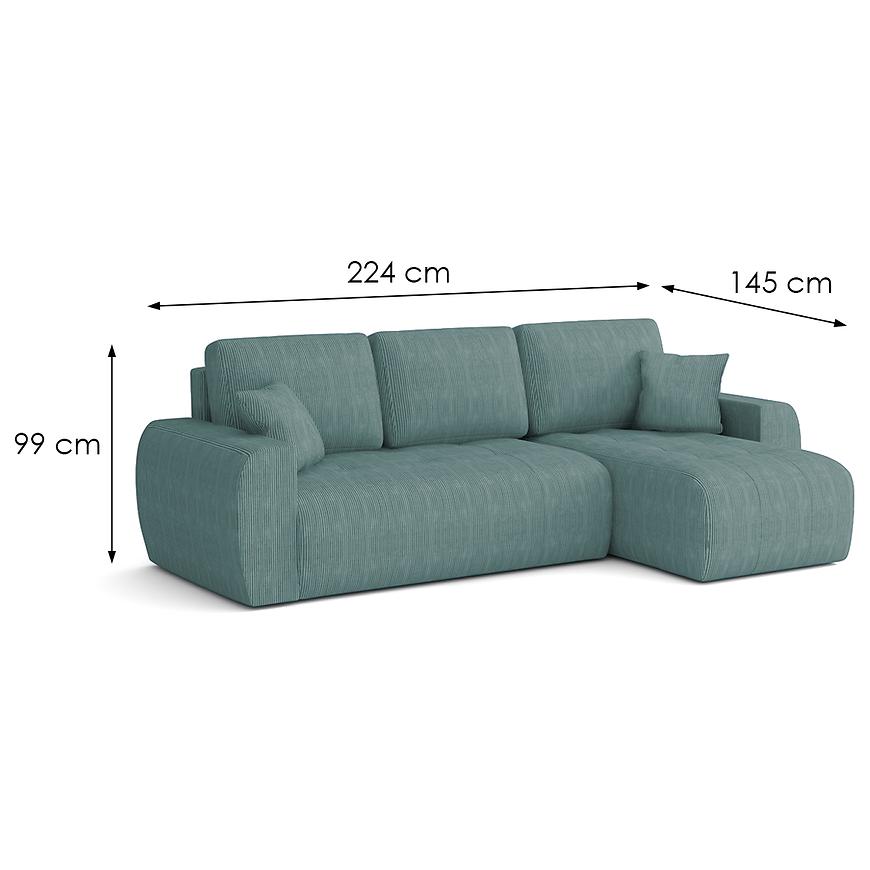 Dodatkowym atutem narożnika jest pojemnik na pościel, który ułatwia przechowywanie kołder i poduszek, pomagając utrzymać porządek w salonie. Całość utrzymana w nowoczesnym stylu świetnie komponuje się z różnymi aranżacjami wnętrz, dodając im elegancji i funkcjonalności.