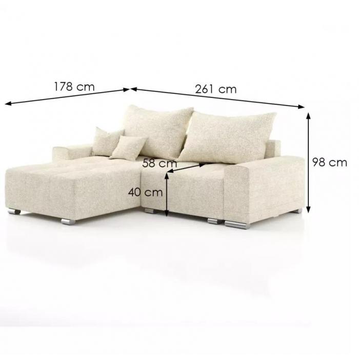 Nowoczesny narożnik Kevin to idealne rozwiązanie zarówno do małego salonu, który w nocy zmienia się w dodatkową sypialnię, ale także większego wnętrza, w którym w ciągu dnia czas spędza cała rodzina. Rozkładana sofa narożna Kevin, której powierzchnia spania wynosi 148x203 cm, posiada jeden pojemnik do przechowywania pościeli. Zastosowany wspomagający sposób rozkładania w tym modelu to DL. Wypełnienie siedziska stanowi sprężyna falista w połączeniu z pianką, które idealnie dopasowują się do sylwetki.