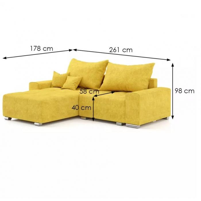 Nowoczesny narożnik Kevin to idealne rozwiązanie zarówno do małego salonu, który w nocy zmienia się w dodatkową sypialnię, ale także większego wnętrza, w którym w ciągu dnia czas spędza cała rodzina. Rozkładana sofa narożna Kevin, której powierzchnia spania wynosi 148x203 cm, posiada jeden pojemnik do przechowywania pościeli. Zastosowany wspomagający sposób rozkładania w tym modelu to DL. Wypełnienie siedziska stanowi sprężyna falista w połączeniu z pianką, które idealnie dopasowują się do sylwetki.