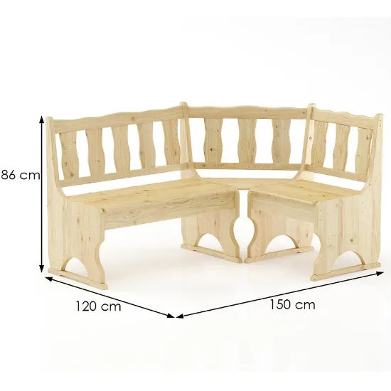 Narożnik Sosna NR103 naturalny o wymiarach 150x120x86 cm zapewnia wygodne miejsce do siedzenia w każdej kuchni. Drewniane siedzisko jest stabilne i trwałe, a jego naturalny kolor wprowadza do wnętrza przytulny i harmonijny charakter.
