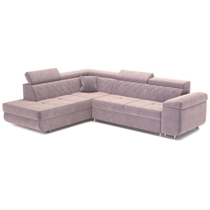 Kanapa narożna Laguna tapicerowana jest przyjemną w dotyku tkaniną w jasny, pastelowym kolorze. To idealna baza do dalszej aranżacji. Delikatne przeszycia zastosowane na tapicerce dają ciekawy element wizualny. Nóżki na których osadzono mebel wykonano z tworzywa sztucznego w srebrnym kolorze. Dodatkowym udogodnieniem są regulowane, ruchome zagłówki oraz lekko profilowane oparcie, które zapewniają komfortowy wypoczynek.