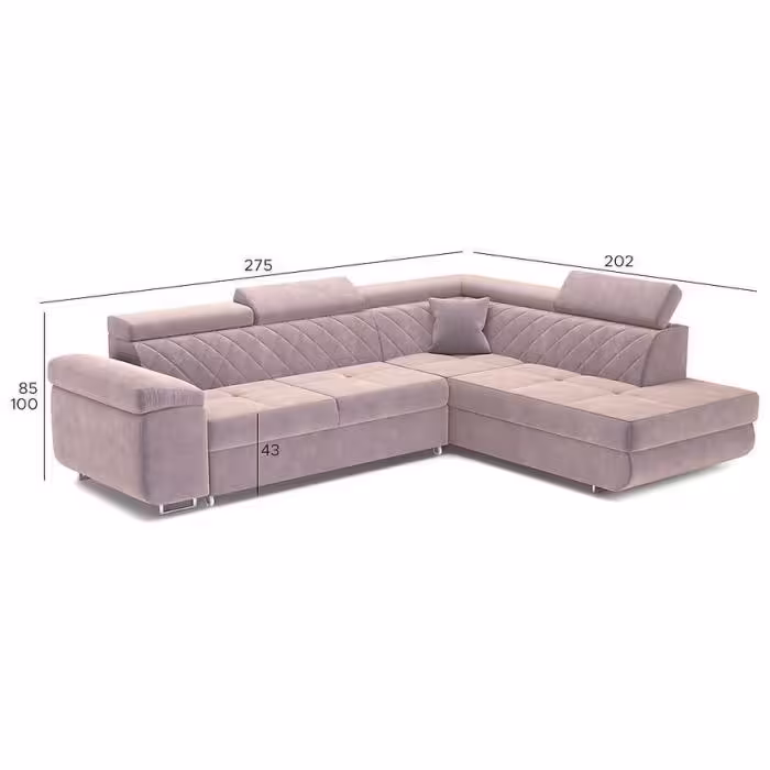 Kanapa narożna Laguna tapicerowana jest przyjemną w dotyku tkaniną w jasny, pastelowym kolorze. To idealna baza do dalszej aranżacji. Delikatne przeszycia zastosowane na tapicerce dają ciekawy element wizualny. Nóżki na których osadzono mebel wykonano z tworzywa sztucznego w srebrnym kolorze. Dodatkowym udogodnieniem są regulowane, ruchome zagłówki oraz lekko profilowane oparcie, które zapewniają komfortowy wypoczynek.