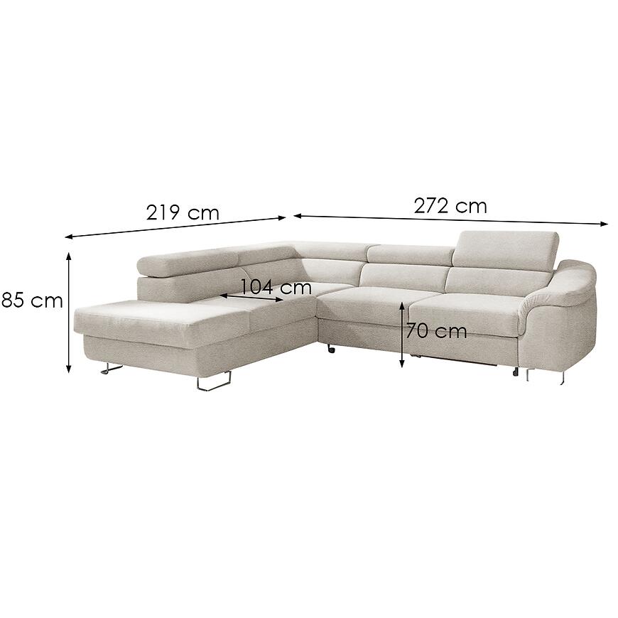 Narożnik Lavos Ot-2r Tula 11 to elegancki i funkcjonalny narożnik w kształcie litery L o dużych wymiarach (272x219 cm). Tapicerka z wysokiej jakości tkaniny w kolorze szarym łączy trwałość z przyjemnym dotykiem. Siedzisko wypełnione sprężyną falistą i pianką zapewnia komfortowy wypoczynek. Wyposażony w funkcję spania (powierzchnia 126x197 cm) oraz pojemnik na pościel, z regulowanym zagłówkiem i stabilnymi, czarnymi nogami. Wymaga montażu.