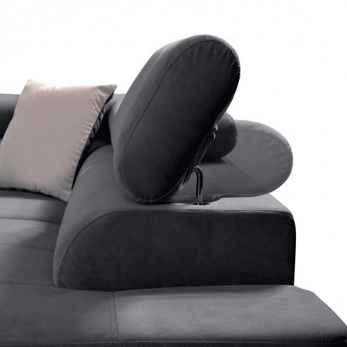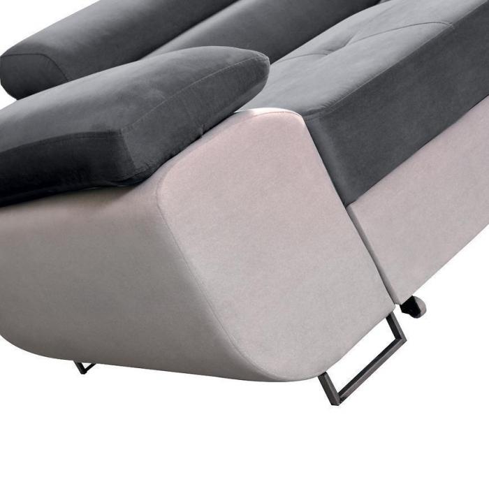 Nowoczesny, rozkładany narożnik z funkcją spania okazjonalnego i pojemnikiem na pościel to bardzo praktyczne rozwiązanie. Powierzchnia spania po rozłożeniu narożnika wynosi 125x208 cm. Zastosowany sposób rozkładania w tym modelu to delfin. Dodatkowo, kanapa posiada jeden pojemnik na pościel. Dodatkowe miejsce do przechowywania docenią właściciele zwłaszcza mniejszych przestrzeni. Regulowane, ruchome zagłówki oraz lekko profilowane oparcie zapewnią komfortowy wypoczynek.