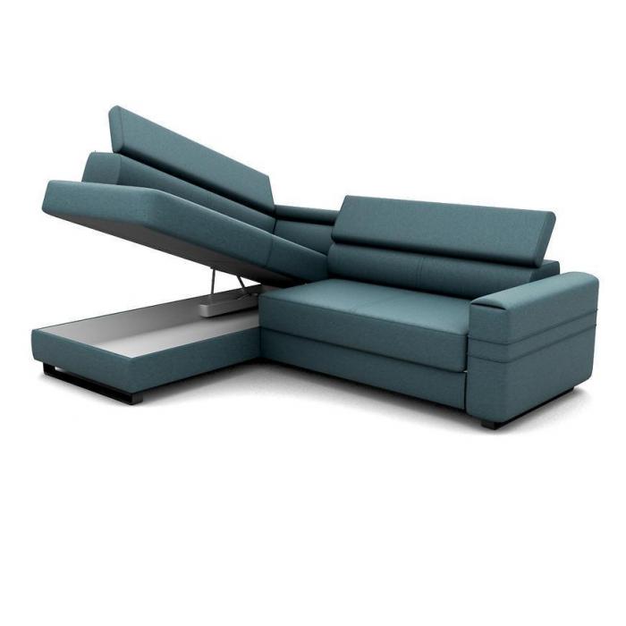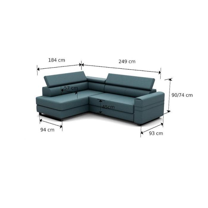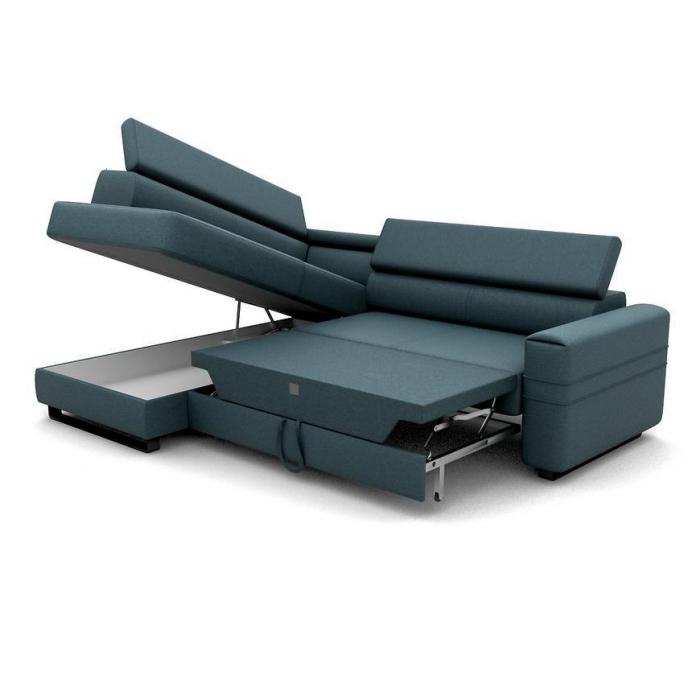 Rozkładana sofa narożna Livio z funkcją spania, posiada jeden pojemnik na pościel - dodatkowe miejsce do przechowywania. Powierzchnia spania po rozłożeniu narożnika wynosi 124x194cm. Zastosowany sposób rozkładania w tym modelu to delfin, prosty i szybki w obsłudze. Regulowane, ruchome zagłówki oraz delikatnie profilowane oparcie zapewniają komfortowy wypoczynek.