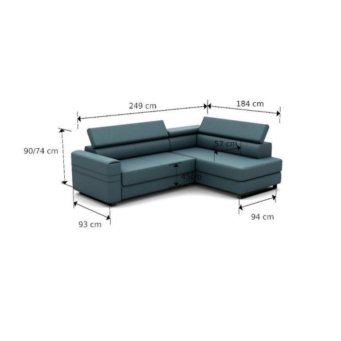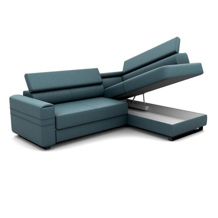 Rozkładana sofa narożna Livio z funkcją spania, posiada jeden pojemnik na pościel - dodatkowe miejsce do przechowywania. Powierzchnia spania po rozłożeniu narożnika wynosi 124x194cm. Zastosowany sposób rozkładania w tym modelu to delfin, prosty i szybki w obsłudze. Regulowane, ruchome zagłówki oraz delikatnie profilowane oparcie zapewniają komfortowy wypoczynek.