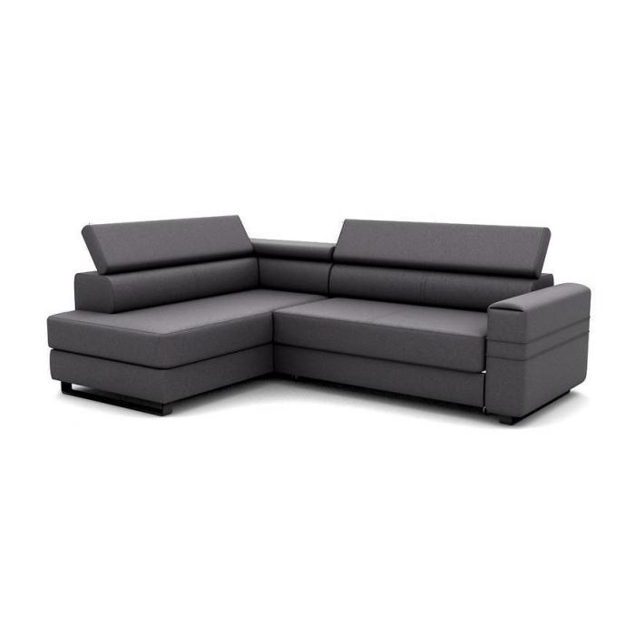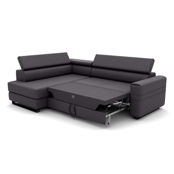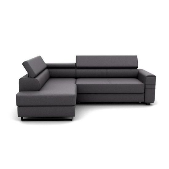Rozkładana sofa narożna Livio z funkcją spania, posiada jeden pojemnik na pościel - dodatkowe miejsce do przechowywania. Powierzchnia spania po rozłożeniu narożnika wynosi 124x194cm. Zastosowany sposób rozkładania w tym modelu to delfin, prosty i szybki w obsłudze. Regulowane, ruchome zagłówki oraz delikatnie profilowane oparcie zapewniają komfortowy wypoczynek.