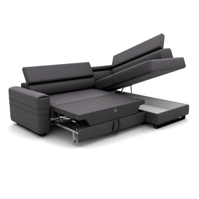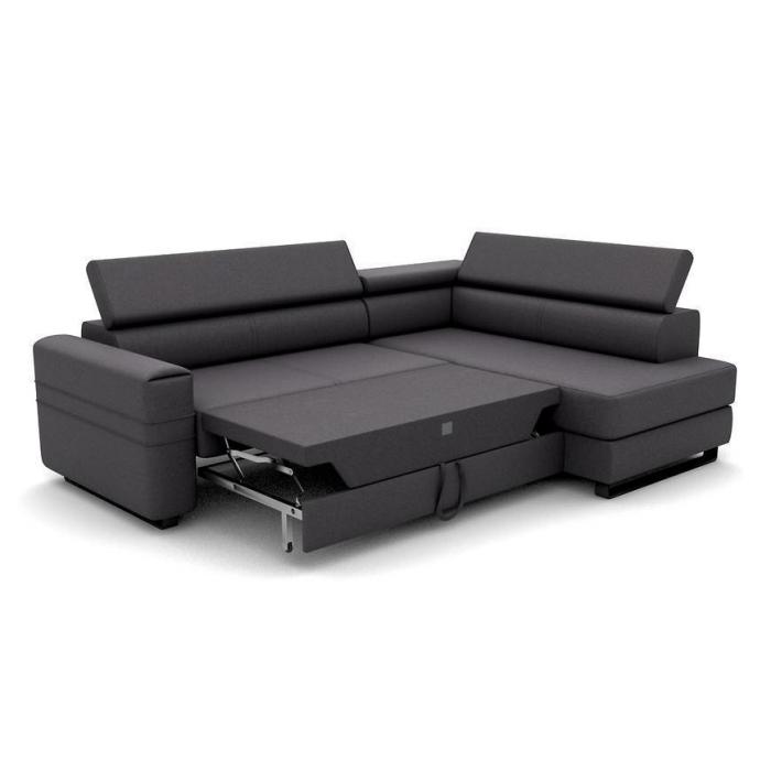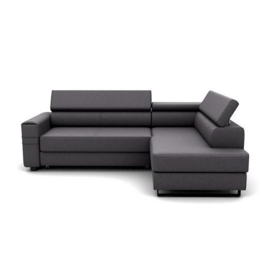 Rozkładana sofa narożna Livio z funkcją spania, posiada jeden pojemnik na pościel - dodatkowe miejsce do przechowywania. Powierzchnia spania po rozłożeniu narożnika wynosi 124x194cm. Zastosowany sposób rozkładania w tym modelu to delfin, prosty i szybki w obsłudze. Regulowane, ruchome zagłówki oraz delikatnie profilowane oparcie zapewniają komfortowy wypoczynek.