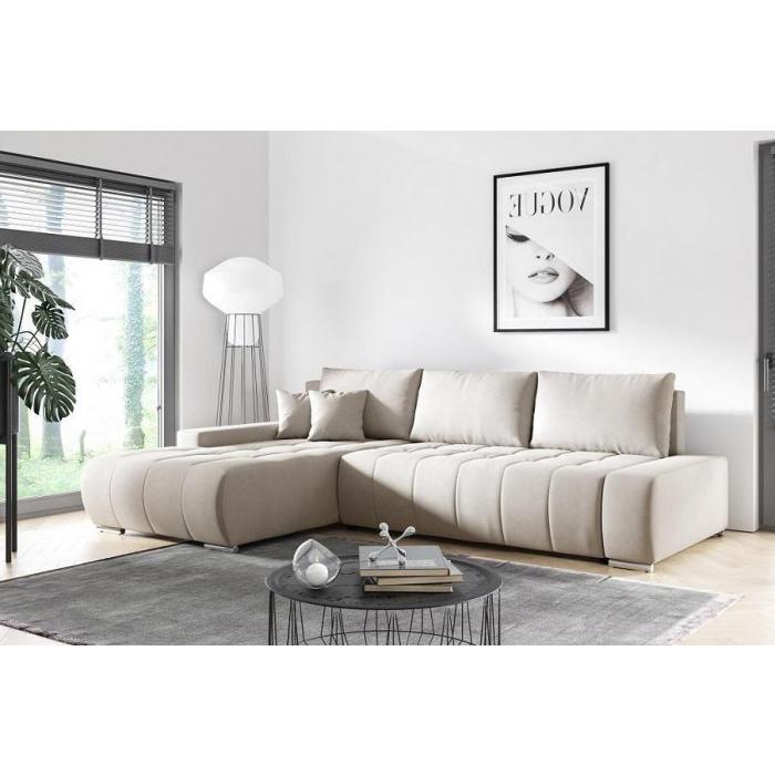 Kanapa narożna z kolekcji Loara jest w kształcie litery L i świetnie wpasuje się zarówno do pokoju dziennego jak i salonu. Tył narożnika jest tapicerowany, dzięki czemu może stać wolno nawet na środku salonu. Narożnik występuje w dwóch wersjach - tkanina Aston oraz Monolith. Tkanina Aston jest wykonana z pluszu, dzięki czemu jest przyjemna w dotyku. Gramatura wynosi 435 g/m2, a ścieralność 40000 - gwarantuje to jakość na długie lata. Natomiast tkanina Monolith jest subtelnie połyskująca i cieniowana, ze względu na kilkutonową kolorystykę. Odświeżenie wyglądu tkaniny pojawia się poprzez przeczesanie dłonią. Tkanina ta jest miękka i miła w dotyku.