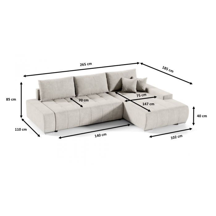 Sofa narożna Loara to najbardziej praktyczny mebel, który będzie pasował do małego salonu, ale znajdzie swoje miejsce również w innym pomieszczeniu. Powierzchnia spania wynosi 140x215cm. Loara posiada jeden pojemnik na pościel, a system rozkładania typu DL to szybki, prosty i wygodny sposób rozkładania. Atutem narożnika jest pikowane siedzisko oraz duże poduszki oparciowe.