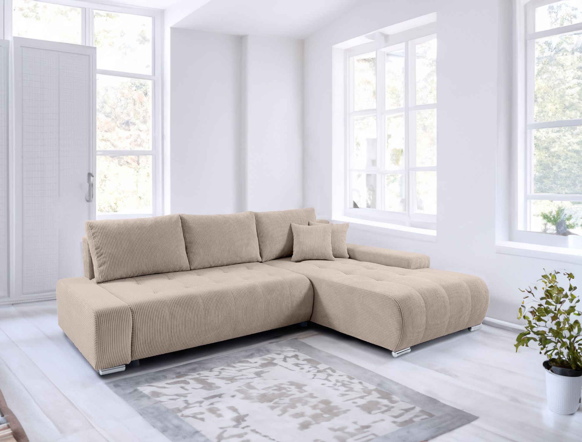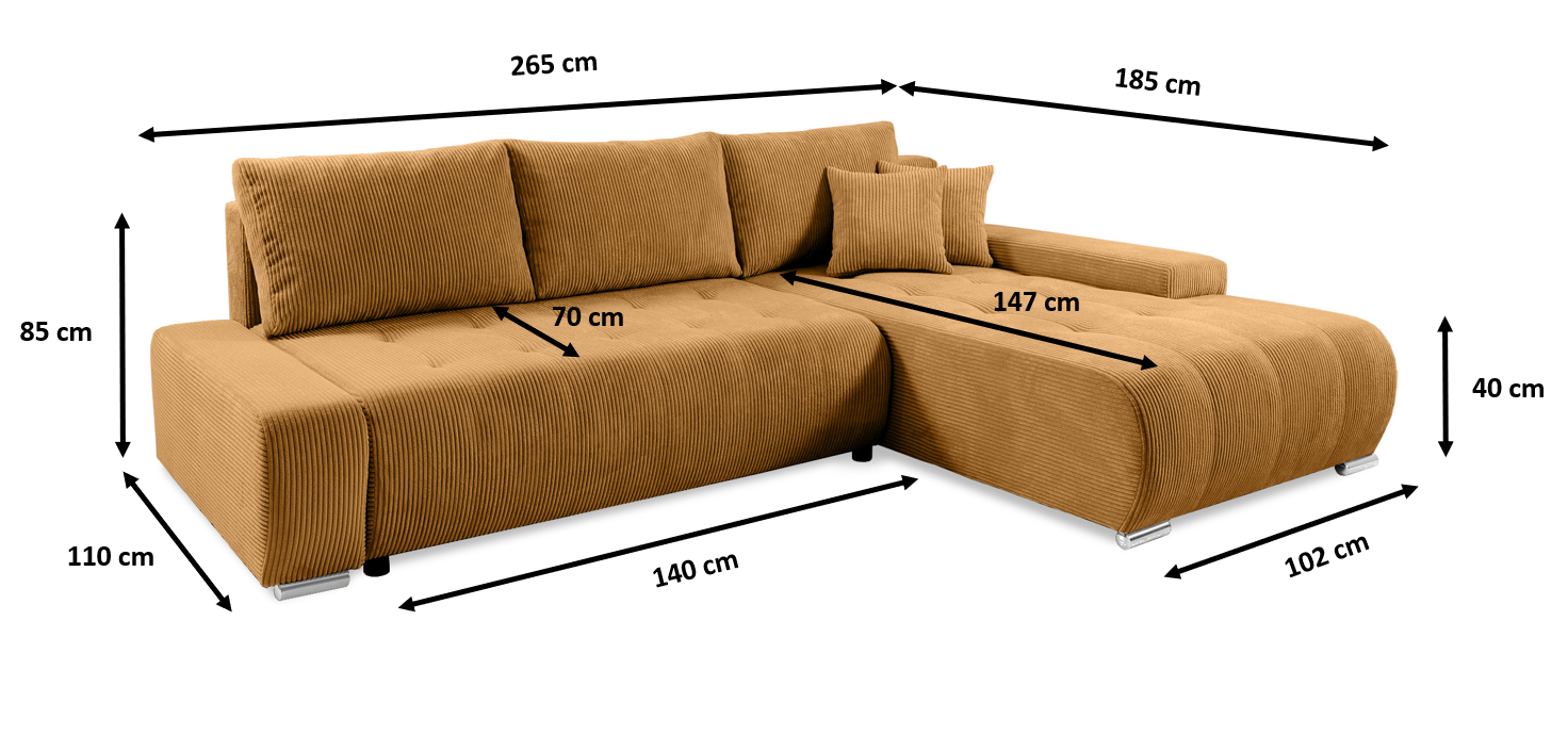 Wygodny narożnik Loara występuje w wielu wersjach kolorystycznych. Obicie narożnika stanowi ultramiękka sztruksowa tkanina w grube prążki. Tył narożnika również obity jest tym samym materiałem. Kolorystyka narożników została idealnie dopasowana do najmodniejszych kolorów panujących w trendach, co pozwala tworzyć niezwykłe kombinacje! W narożniku zastosowano automatyczny sposób rozkładania DL. To łatwy i szybki sposób ułatwiający rozkładanie.