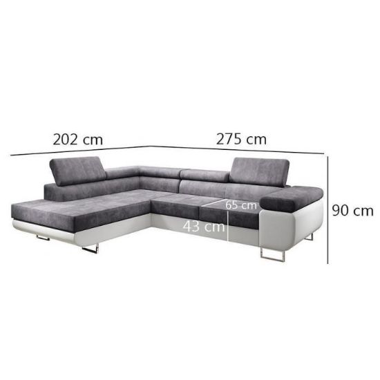 Sofa narożna posiada pojemnik na pościel, w którym zmieszczą się kołdry zachowując porządek w pomieszczeniu. Narożnik z funkcją spania okazjonalnego wyposażony w sprężyny faliste, wygodne oparcie oraz regulowany zagłówek zadowoli nawet najbardziej wymagających miłośników wielogodzinnych drzemek. Wysokość siedziska wynosi 43cm.
