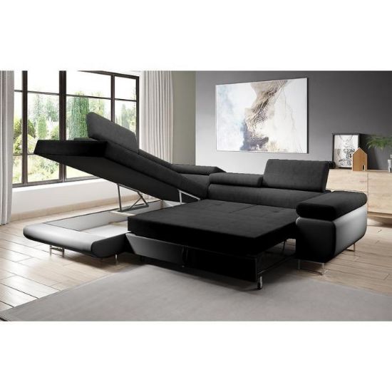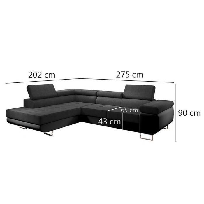 Sofa narożna posiada pojemnik na pościel, w którym zmieszczą się kołdry zachowując porządek w pomieszczeniu. Narożnik z funkcją spania okazjonalnego wyposażony w sprężyny faliste, wygodne oparcie oraz regulowany zagłówek zadowoli nawet najbardziej wymagających miłośników wielogodzinnych drzemek. Wysokość siedziska wynosi 43cm.