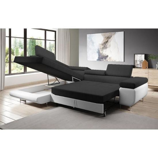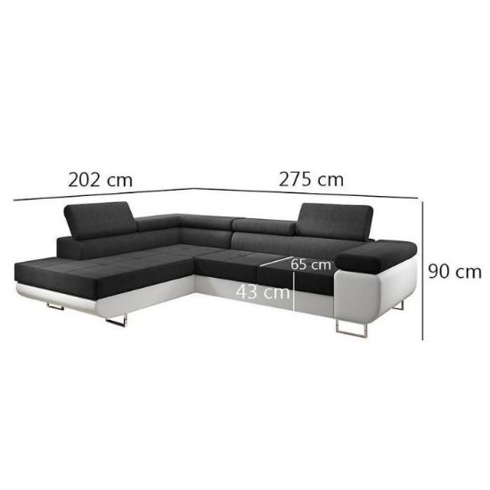 Sofa narożna posiada pojemnik na pościel, w którym zmieszczą się kołdry zachowując porządek w pomieszczeniu. Narożnik z funkcją spania okazjonalnego wyposażony w sprężyny faliste, wygodne oparcie oraz regulowany zagłówek zadowoli nawet najbardziej wymagających miłośników wielogodzinnych drzemek. Wysokość siedziska wynosi 43cm.