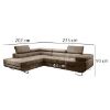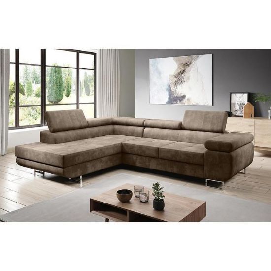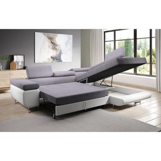 Sofa narożna posiada pojemnik na pościel, w którym zmieszczą się kołdry zachowując porządek w pomieszczeniu. Narożnik wyposażony w sprężyny faliste, wygodne oparcie oraz regulowany zagłówek zadowoli nawet najbardziej wymagających miłośników wielogodzinnych drzemek. Wysokość siedziska wynosi 43cm.