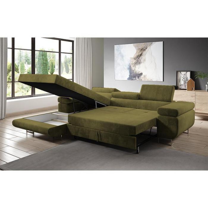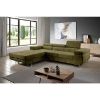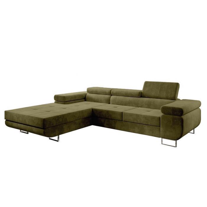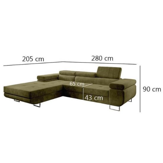 Sofa narożna posiada pojemnik na pościel, w którym zmieszczą się kołdry zachowując porządek w pomieszczeniu. Narożnik z funkcją spania okazjonalnego wyposażony w sprężyny faliste, wygodne oparcie oraz regulowany zagłówek zadowoli nawet najbardziej wymagających miłośników wielogodzinnych drzemek. Wysokość siedziska wynosi 43cm.