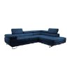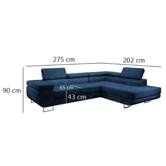 Sofa narożna posiada pojemnik na pościel, w którym zmieszczą się kołdry zachowując porządek w pomieszczeniu. Narożnik codziennego wyposażony w sprężyny faliste, wygodne oparcie oraz regulowany zagłówek zadowoli nawet najbardziej wymagających miłośników wielogodzinnych drzemek. Wysokość siedziska wynosi 43cm.