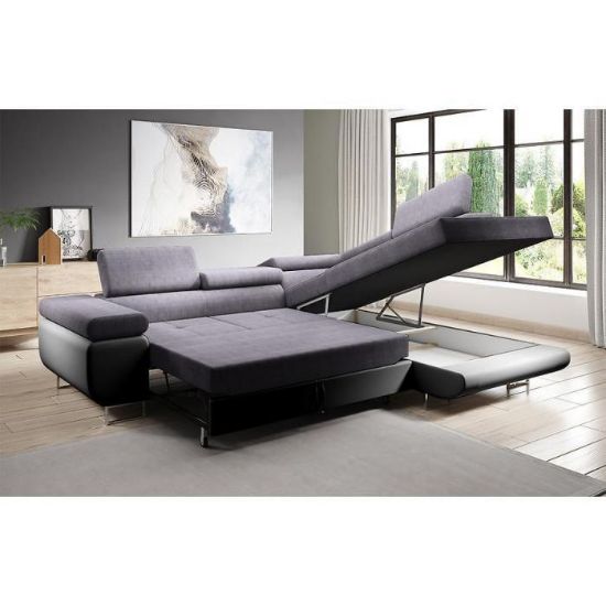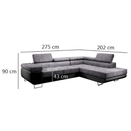 Sofa narożna posiada pojemnik na pościel, w którym zmieszczą się kołdry zachowując porządek w pomieszczeniu. Narożnik z funkcją spania okazjonalnego wyposażony w sprężyny faliste, wygodne oparcie oraz regulowany zagłówek zadowoli nawet najbardziej wymagających miłośników wielogodzinnych drzemek. Wysokość siedziska wynosi 43cm.