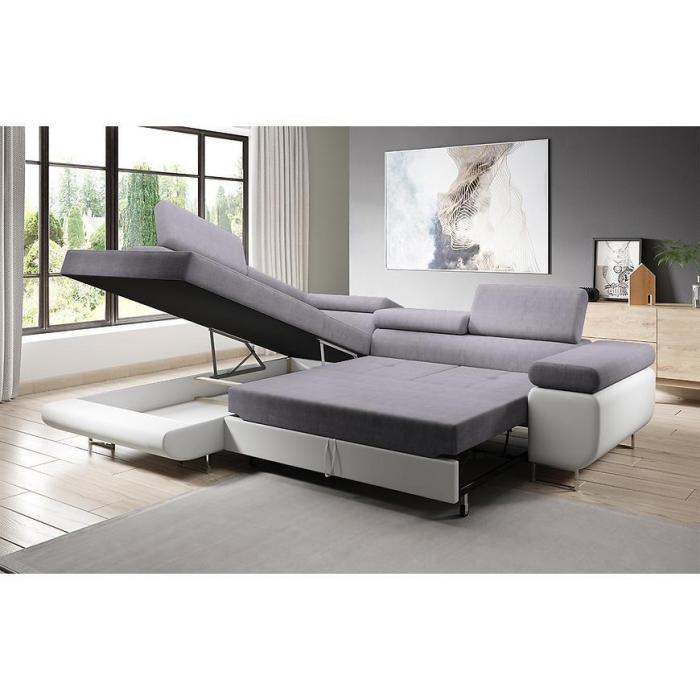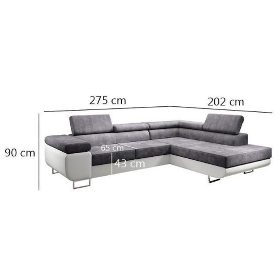 Sofa narożna posiada pojemnik na pościel, w którym zmieszczą się kołdry zachowując porządek w pomieszczeniu. Narożnik z funkcją spania okazjonalnego wyposażony w sprężyny faliste, wygodne oparcie oraz regulowany zagłówek zadowoli nawet najbardziej wymagających miłośników wielogodzinnych drzemek. Wysokość siedziska wynosi 43cm.