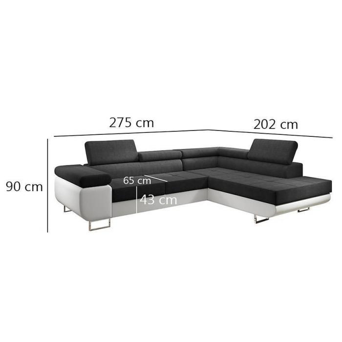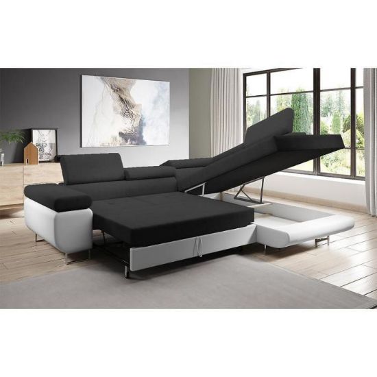 Sofa narożna posiada pojemnik na pościel, w którym zmieszczą się kołdry zachowując porządek w pomieszczeniu. Narożnik z funkcją spania okazjonalnego wyposażony w sprężyny faliste, wygodne oparcie oraz regulowany zagłówek zadowoli nawet najbardziej wymagających miłośników wielogodzinnych drzemek. Wysokość siedziska wynosi 43cm.