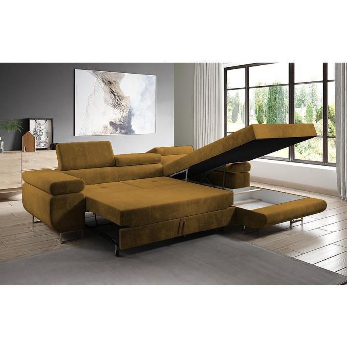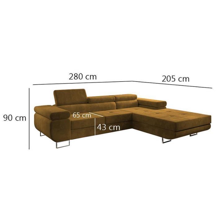 Sofa narożna posiada pojemnik na pościel, w którym zmieszczą się kołdry zachowując porządek w pomieszczeniu. Narożnik z funkcją spania okazjonalnego wyposażony w sprężyny faliste, wygodne oparcie oraz regulowany zagłówek zadowoli nawet najbardziej wymagających miłośników wielogodzinnych drzemek. Wysokość siedziska wynosi 43cm.