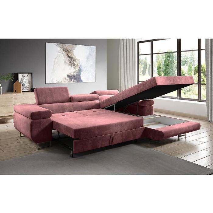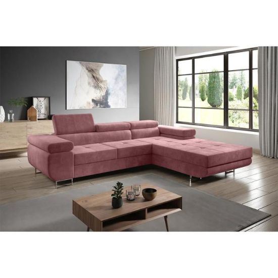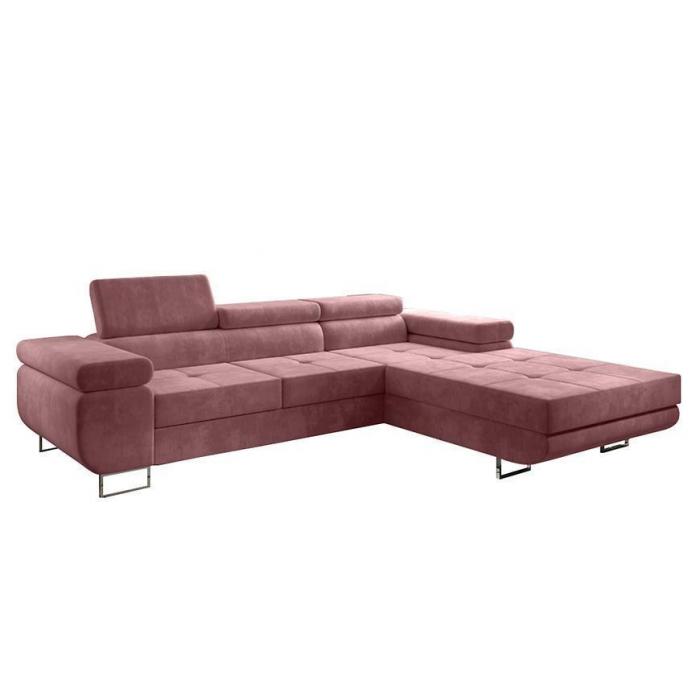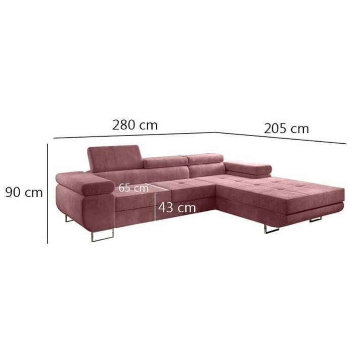 Sofa narożna posiada pojemnik na pościel, w którym zmieszczą się kołdry zachowując porządek w pomieszczeniu. Narożnik z funkcją spania okazjonalnego wyposażony w sprężyny faliste, wygodne oparcie oraz regulowany zagłówek zadowoli nawet najbardziej wymagających miłośników wielogodzinnych drzemek. Wysokość siedziska wynosi 43cm.