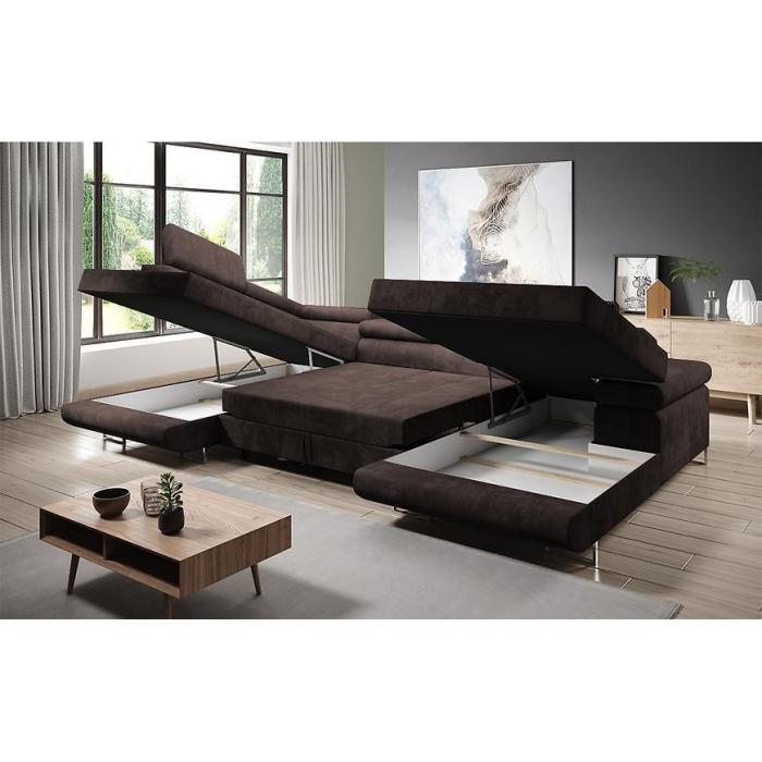 Sofa narożna posiada pojemnik na pościel, w którym zmieszczą się kołdry zachowując porządek w pomieszczeniu. Narożnik z funkcją spania okazjonalnego wyposażony w sprężyny faliste, wygodne oparcie oraz regulowany zagłówek zadowoli nawet najbardziej wymagających miłośników wielogodzinnych drzemek. Wysokość siedziska wynosi 43cm.