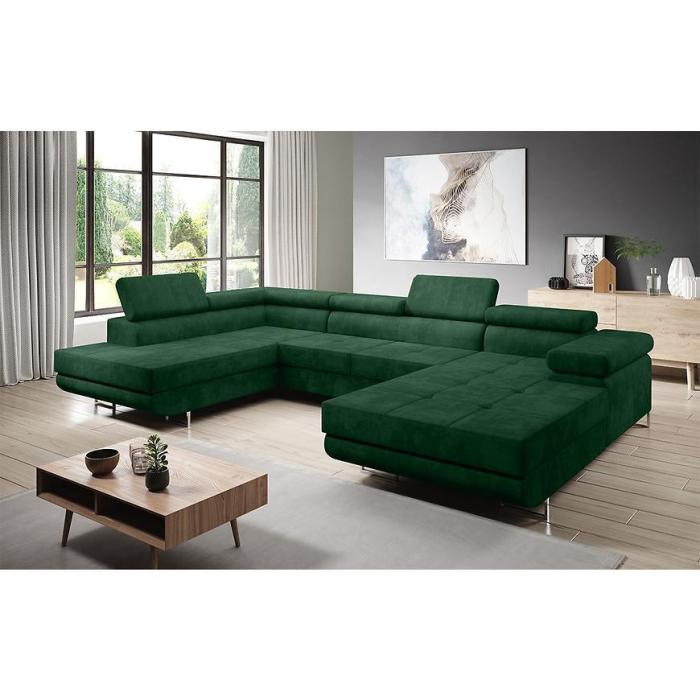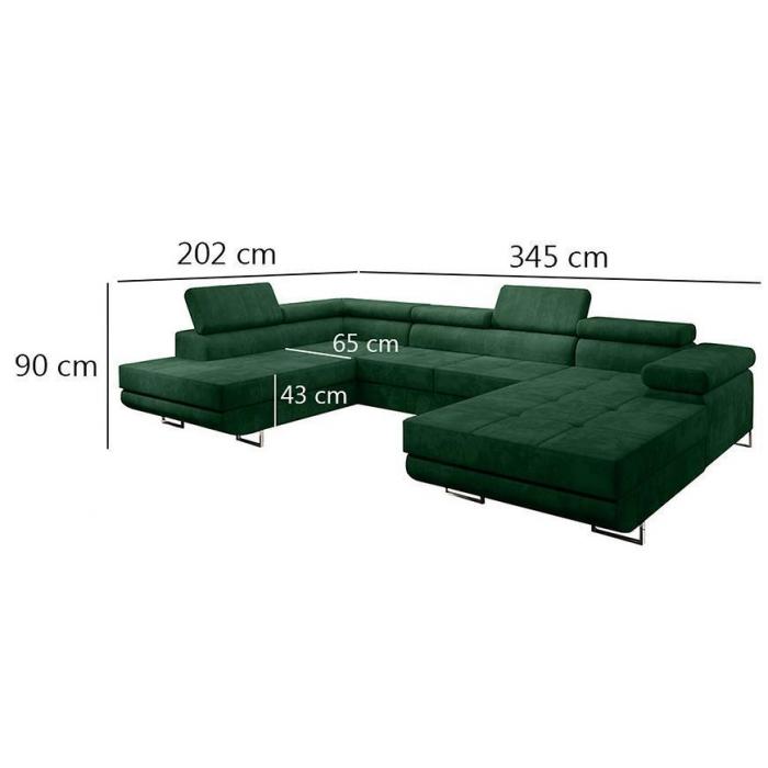 Sofa narożna posiada pojemnik na pościel, w którym zmieszczą się kołdry zachowując porządek w pomieszczeniu. Narożnik z funkcją spania okazjonalnego wyposażony w sprężyny faliste, wygodne oparcie oraz regulowany zagłówek zadowoli nawet najbardziej wymagających miłośników wielogodzinnych drzemek. Wysokość siedziska wynosi 43cm.