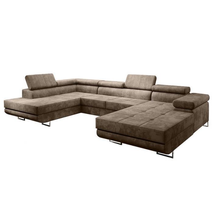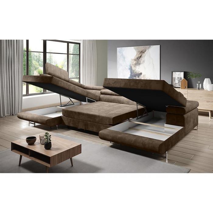 Sofa narożna posiada pojemnik na pościel, w którym zmieszczą się kołdry zachowując porządek w pomieszczeniu. Narożnik z funkcją spania okazjonalnego wyposażony w sprężyny faliste, wygodne oparcie oraz regulowany zagłówek zadowoli nawet najbardziej wymagających miłośników wielogodzinnych drzemek. Wysokość siedziska wynosi 43cm.