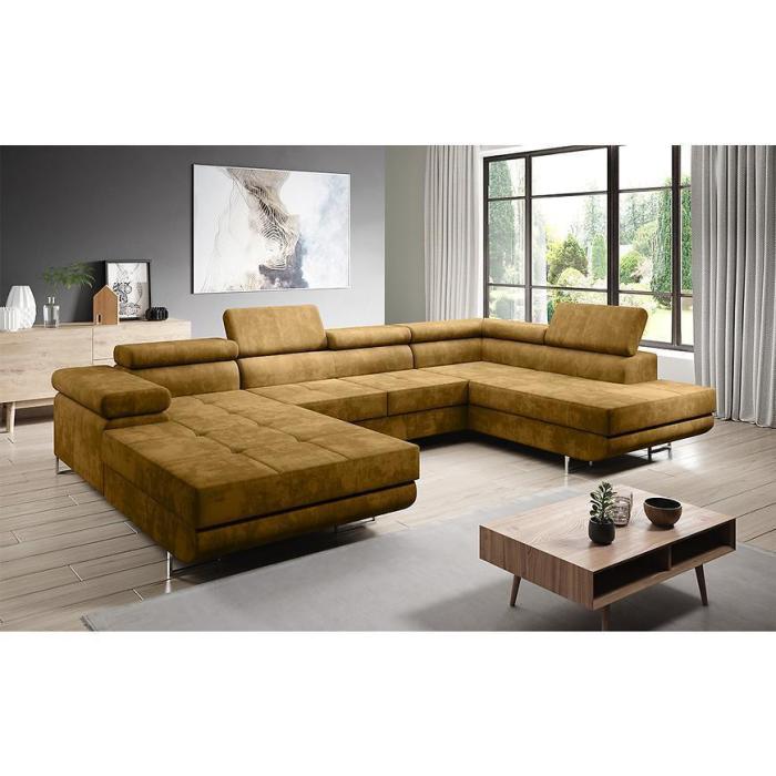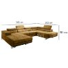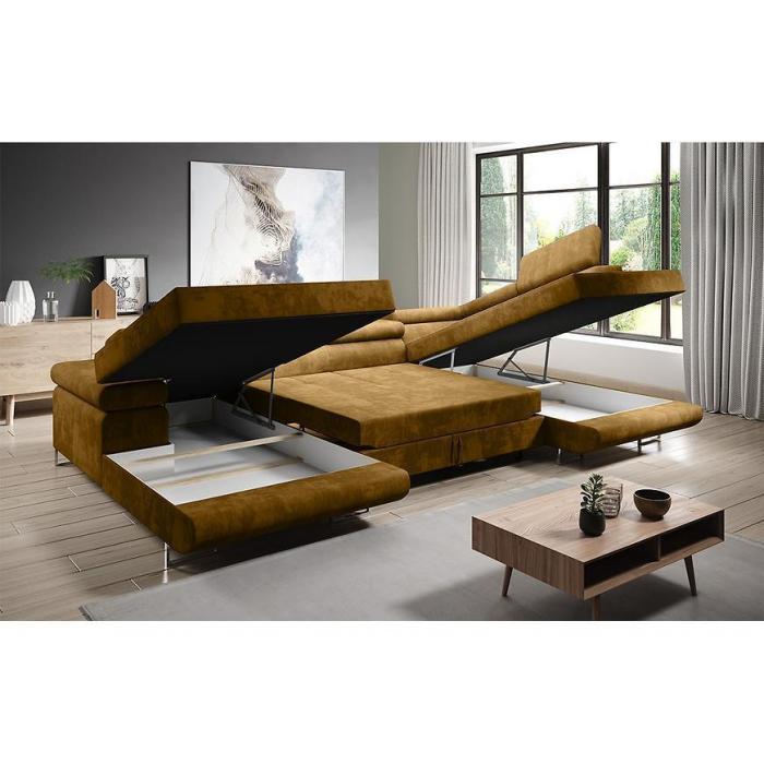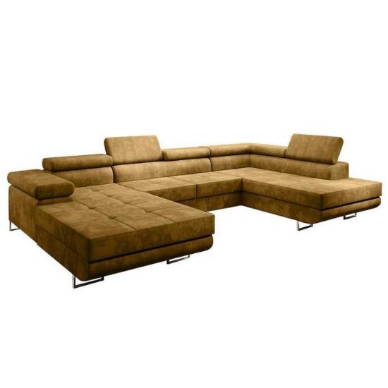 Sofa narożna posiada pojemnik na pościel, w którym zmieszczą się kołdry zachowując porządek w pomieszczeniu. Narożnik z funkcją okazjonalego spania wyposażony w sprężyny faliste, wygodne oparcie oraz regulowany zagłówek zadowoli nawet najbardziej wymagających miłośników wielogodzinnych drzemek. Wysokość siedziska wynosi 43cm.