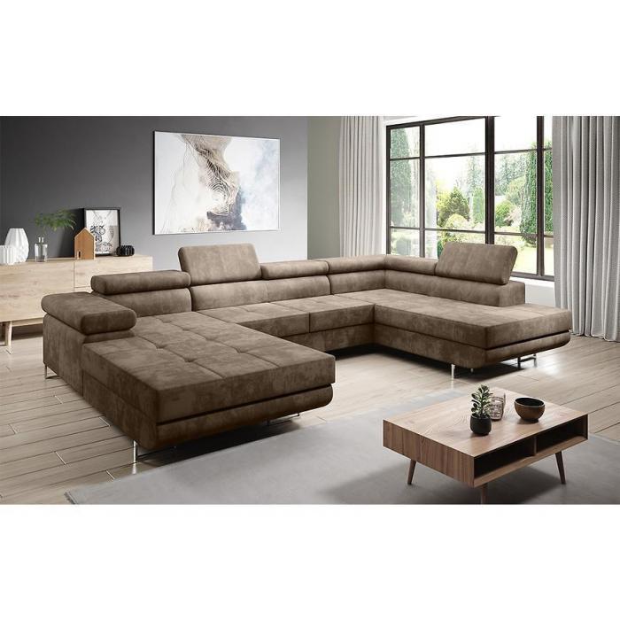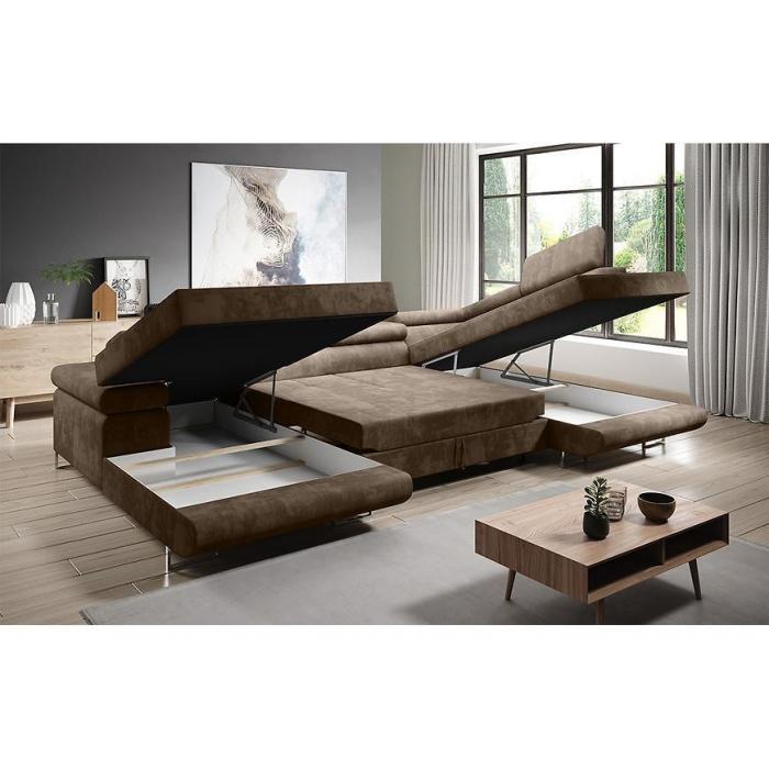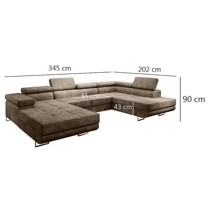 Sofa narożna posiada pojemnik na pościel, w którym zmieszczą się kołdry zachowując porządek w pomieszczeniu. Narożnik z funkcją spania okazjonalnego wyposażony w sprężyny faliste, wygodne oparcie oraz regulowany zagłówek zadowoli nawet najbardziej wymagających miłośników wielogodzinnych drzemek. Wysokość siedziska wynosi 43cm.