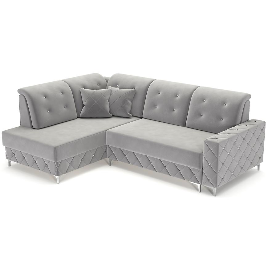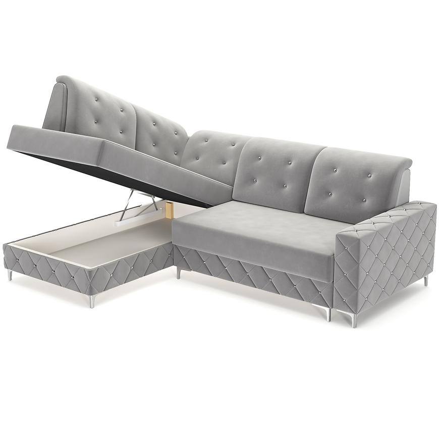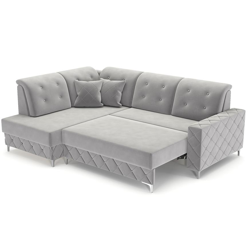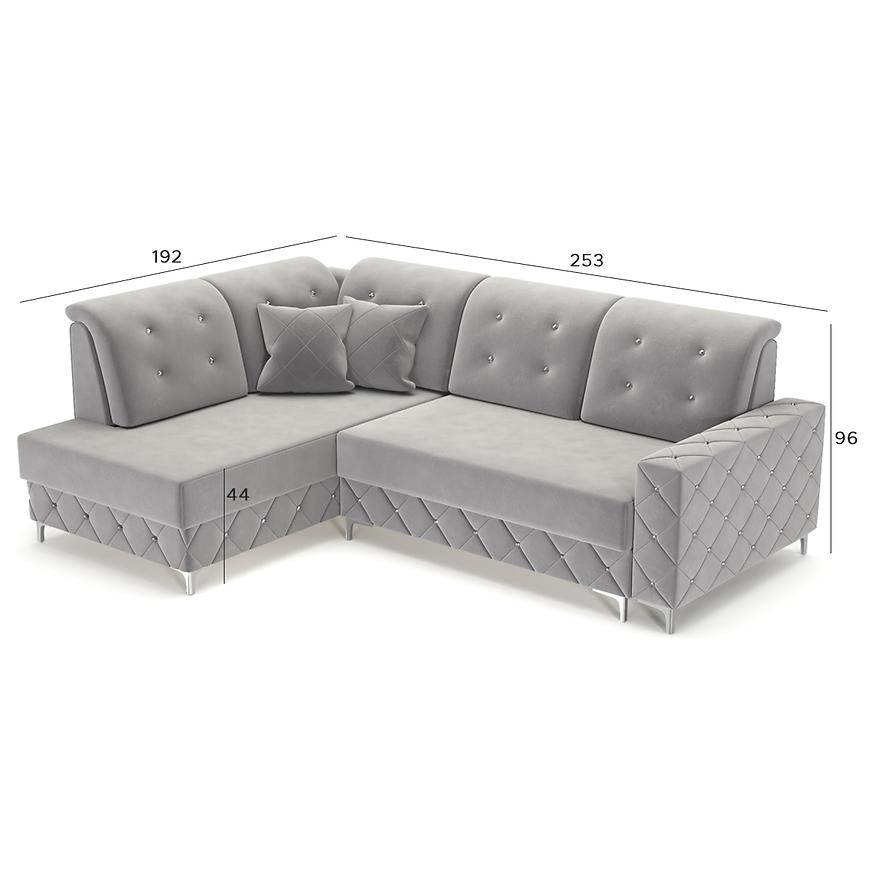 Narożnik Lucas L Monolith 85 to funkcjonalny narożnik w kształcie L z orientacją lewą. Wymiary 253x192x96 cm, powierzchnia spania 140x190 cm oraz pojemnik na pościel zapewniają wygodę i praktyczność. Siedzisko wypełnione sprężyną falistą i pianką, mechanizm rozkładania puma, tapicerka w eleganckiej szarej tkaninie, srebrne nogi i komplet poduszek w zestawie.