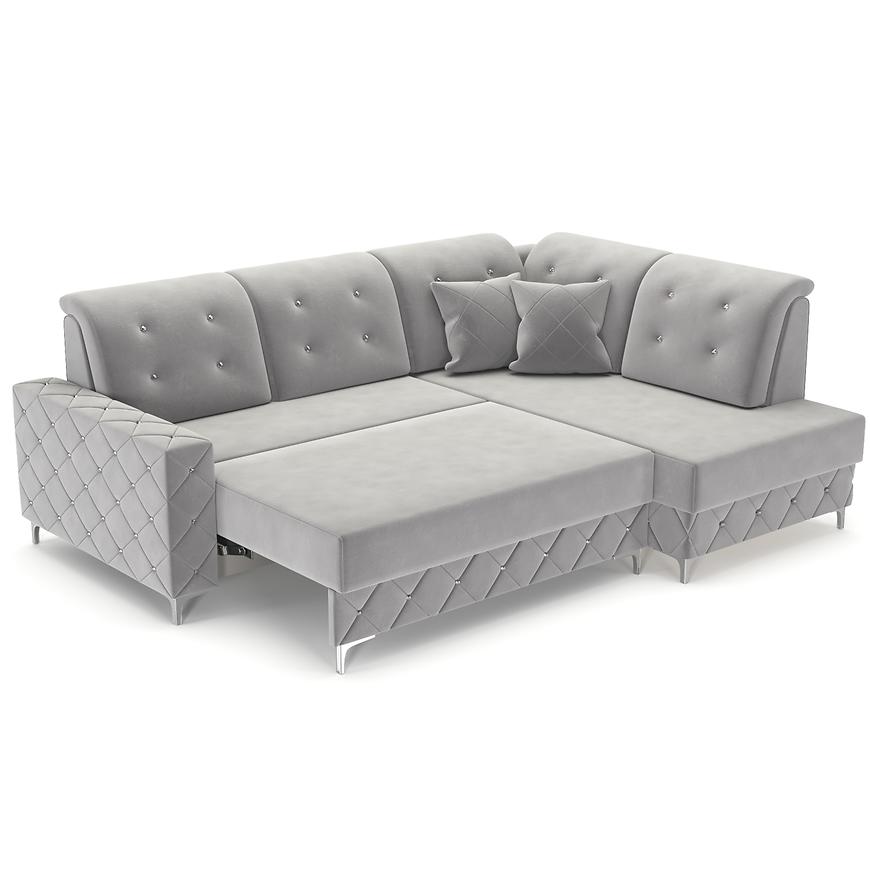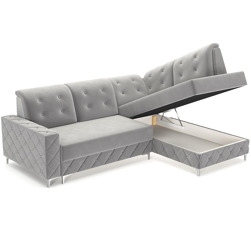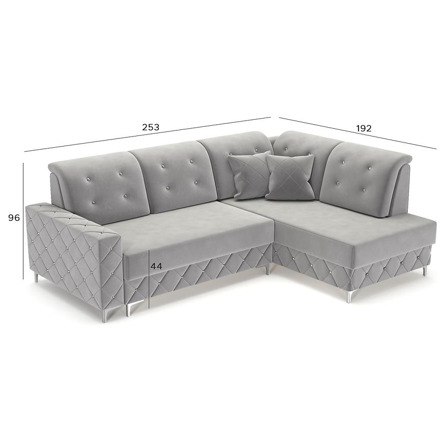 Narożnik Lucas P Monolith 85 to stylowy i funkcjonalny narożnik w kształcie L z orientacją prawą. Wymiary 253x192x96 cm, powierzchnia spania 140x190 cm i pojemnik na pościel zapewniają wygodę. Siedzisko wypełnione sprężyną falistą i pianką, mechanizm rozkładania puma, tapicerka w eleganckiej szarej tkaninie, srebrne nogi i poduszki w komplecie.