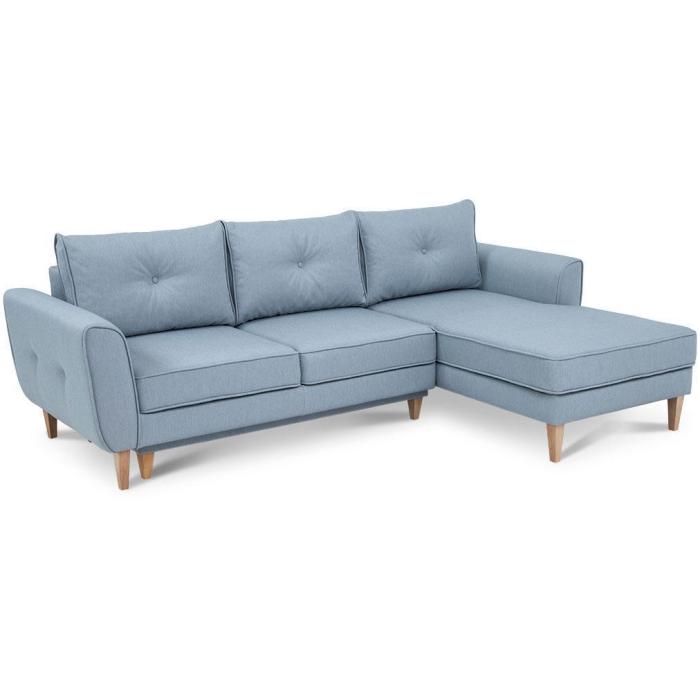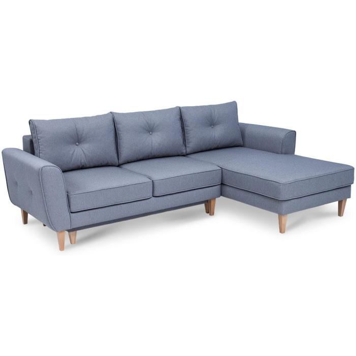 Kanapa narożna Madras tapicerowana jest tkaniną w delikatnym, stonowanym odcieniu. Prosta, klasyczna bryła świetnie sprawdzi się w pokoju dziennym czy pokoju młodzieżowym. Delikatne pikowania na poduszkach i bokach kanapy tworzą ciekawy element dekoracyjny. Jasne, wysokie drewniane nóżki nie tylko stabilizują mebel, ale umożliwiają także dostęp do przestrzeni pod spodem podczas sprzątania.