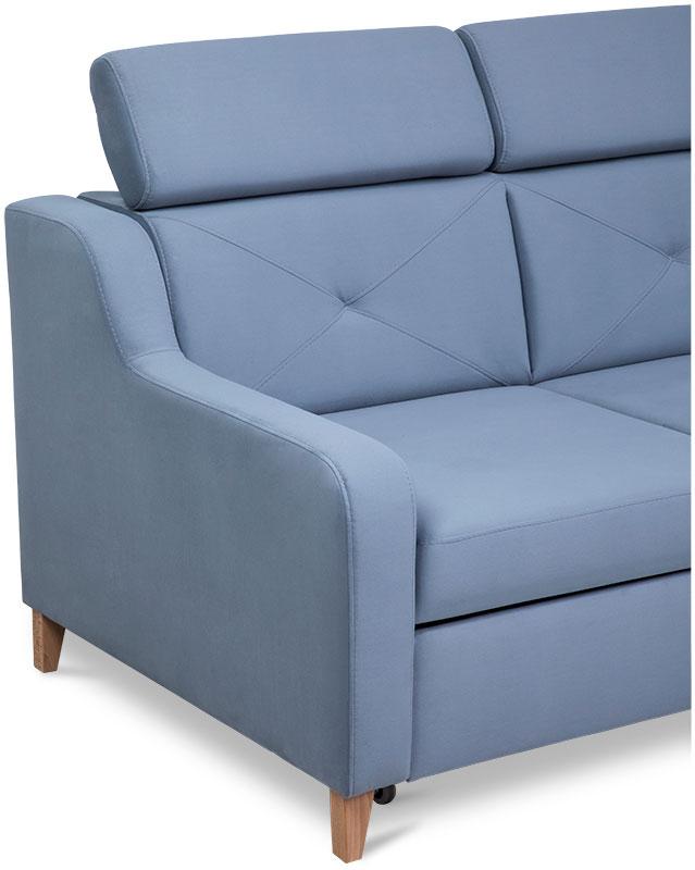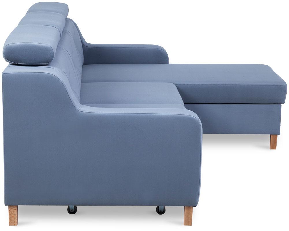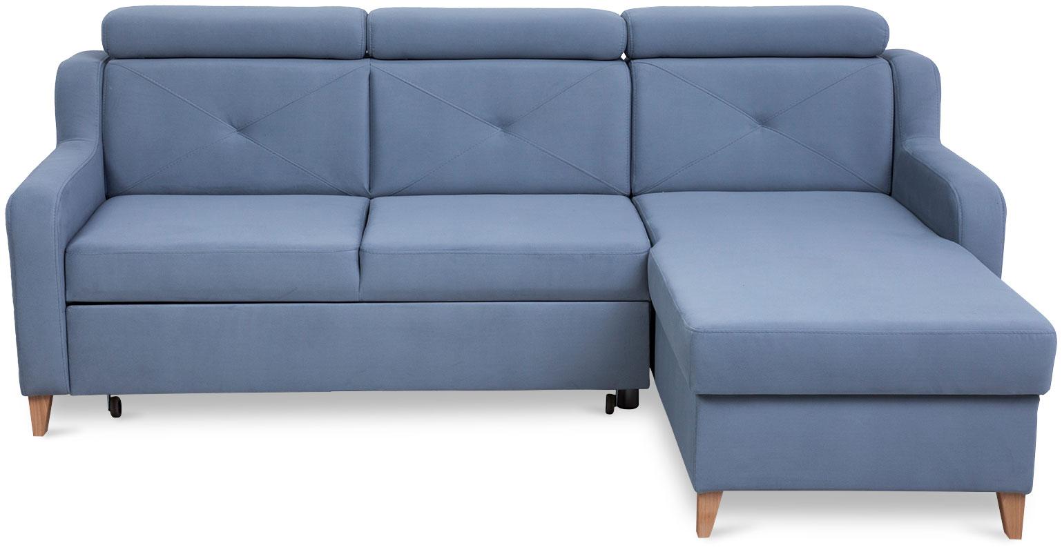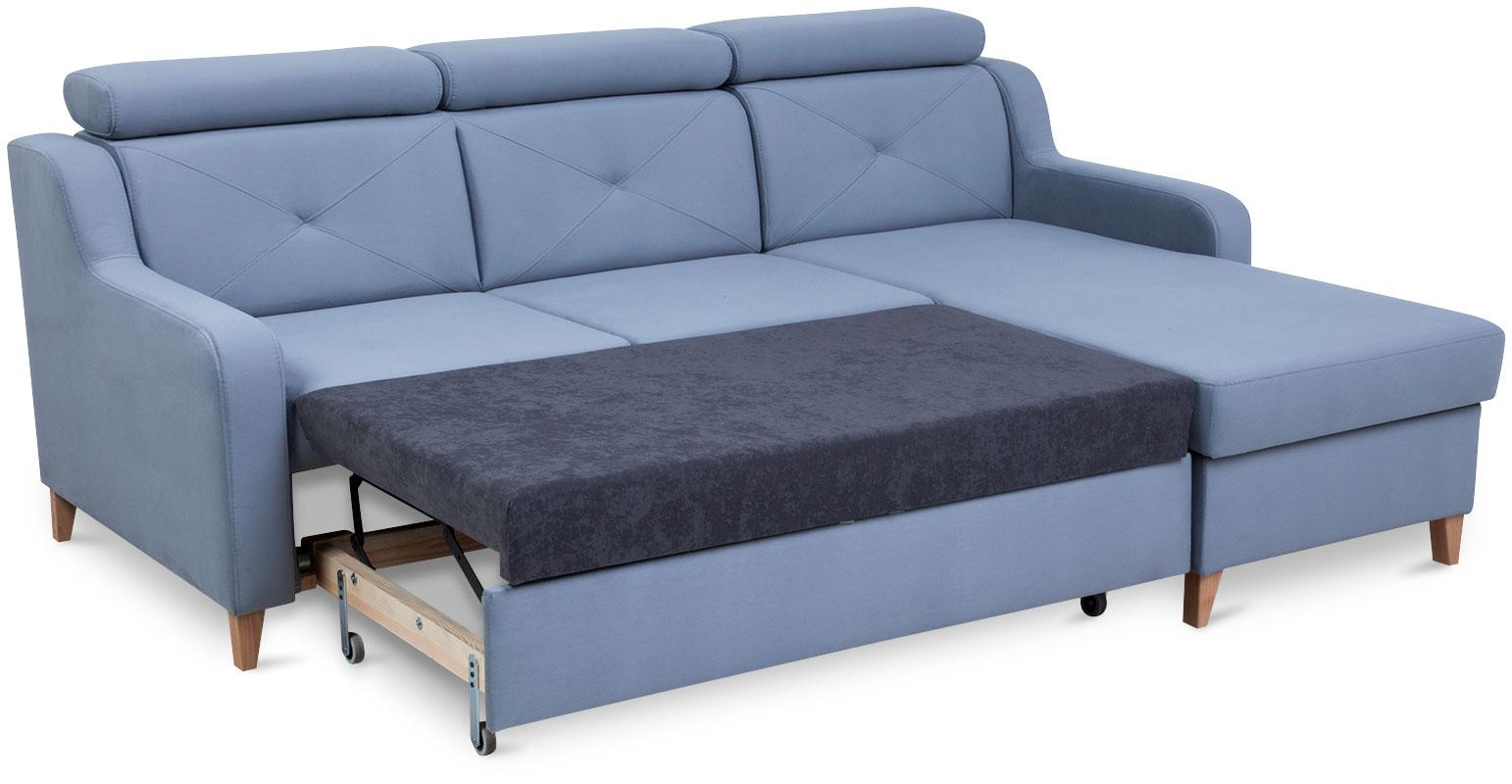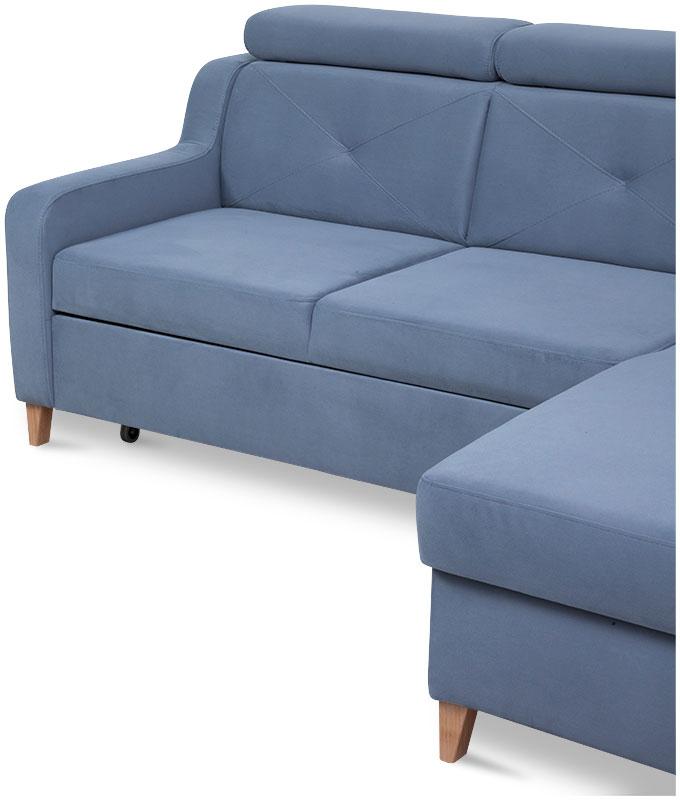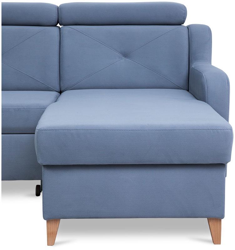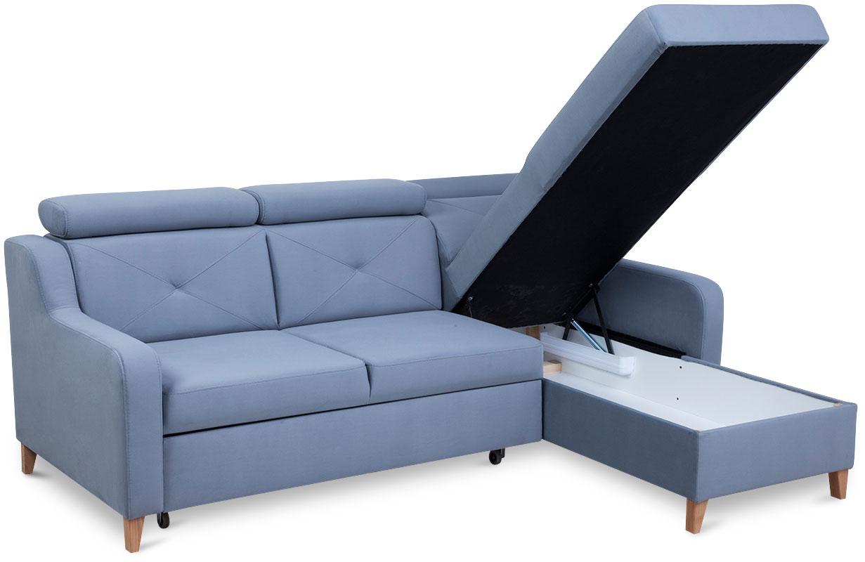 Narożnik Marbella w kolorze popielatym z funkcją spania, mechanizmem ułatwiającym rozkładanie oraz pojemnikiem na pościel. Narożnik wykonany w tkaninie CASABLANCA. Jest to tkanina o specjalnych właściwościach - trudnopalna, odporna na wchłanianie płynów (technologia uszlachetniania tkanin Cleanaboo) oraz jest przyjazna dla zwierząt, ponieważ nie jest podatna na zaciąganie i piling. Model dostępny w opcji prawej lub lewej. Narożnik posiada stabilne oparcie oraz regulowane zagłówki, co znacznie podnosi komfort wypoczynku. W siedzisku narożnika zastosowano sprężynę falistą oraz piankę. Sposób rozkładania delfin. Powierzchnia spania o wymiarach 125x195 cm. Wysokie, drewniane nóżki. Na oparciu zastosowane ozdobne przeszycia i wciągi.