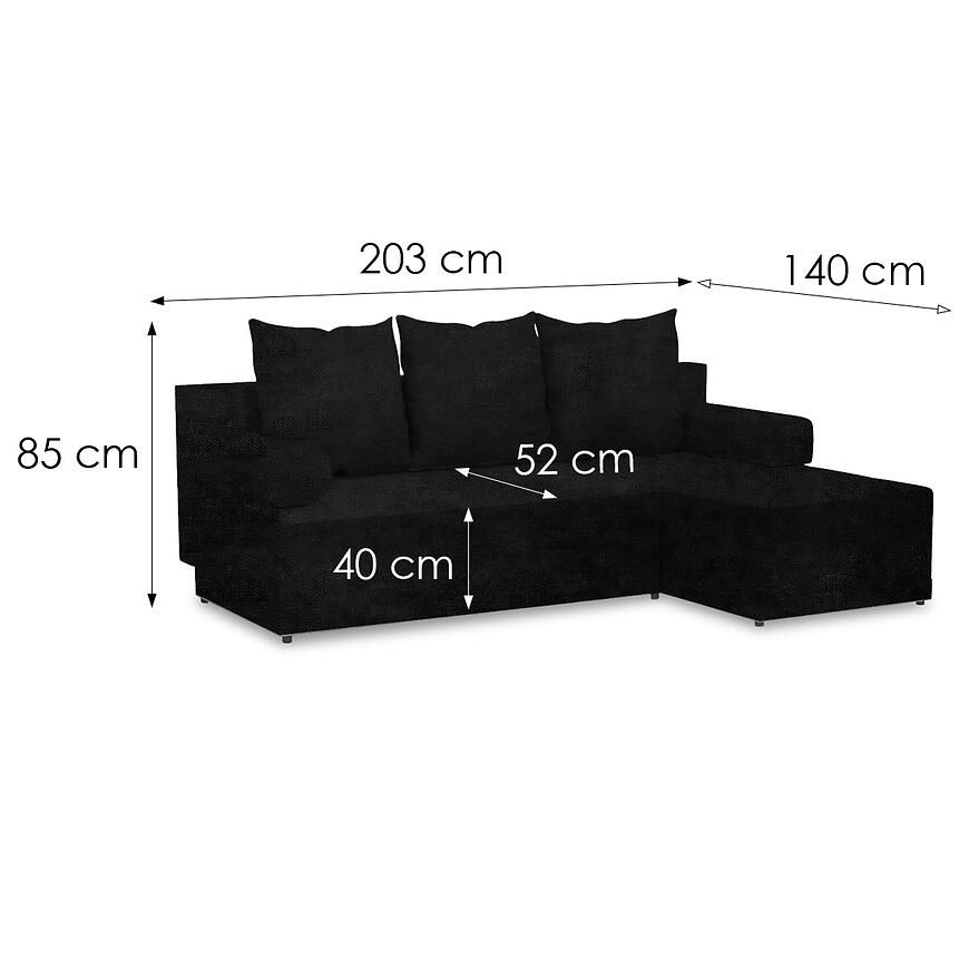 Narożnik Max Fjord 19 uniwersalny to kompaktowy narożnik w klasycznym stylu, w kształcie litery L, idealny do mniejszych przestrzeni. Wyposażony w funkcję spania o powierzchni 203×125 cm oraz pojemnik na pościel, zapewnia praktyczne rozwiązania do codziennego użytku. Tapicerowany trwałą czarną tkaniną, z wypełnieniem na piance, oferuje wygodne i sprężyste siedzisko. Stabilne czarne nóżki podkreślają elegancję mebla, a zestaw uzupełniają dopasowane poduszki dekoracyjne. Solidny wybór dla osób ceniących komfort i funkcjonalność.