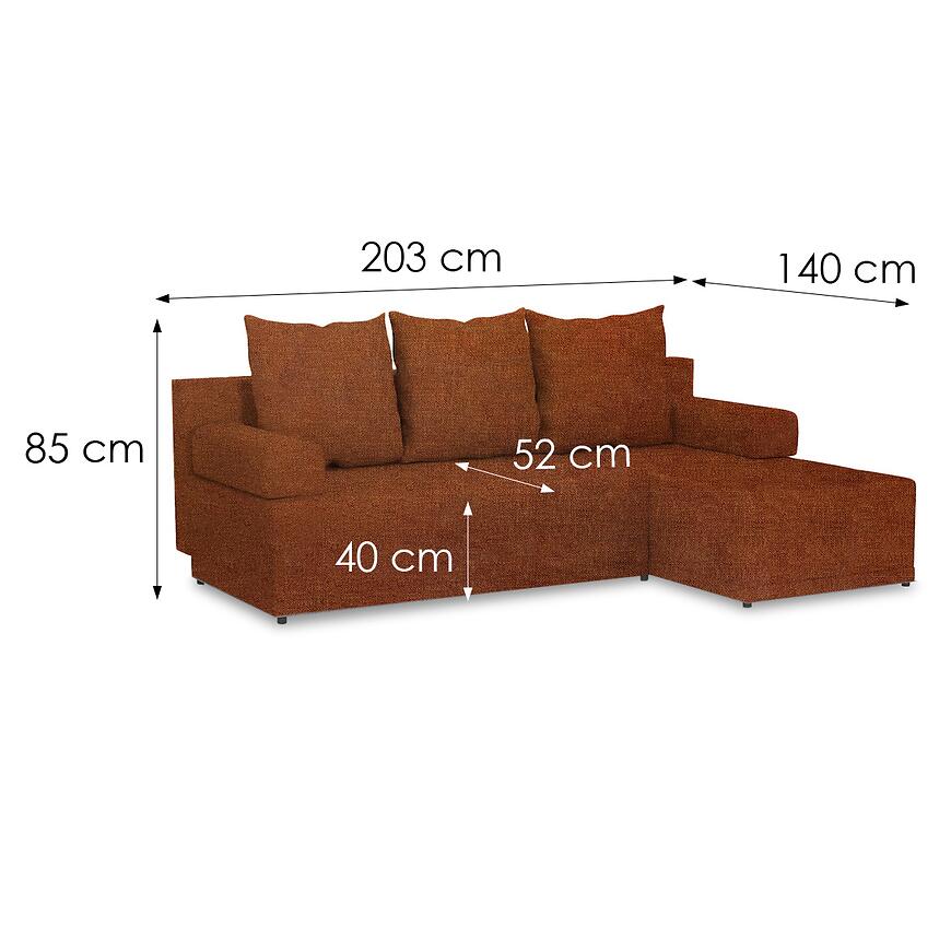 Narożnik Max Fjord 8 uniwersalny to mały narożnik w klasycznym stylu, w kształcie litery L, łączący komfort i funkcjonalność. Posiada funkcję spania o powierzchni 203×125 cm oraz pojemnik na pościel, co ułatwia codzienne użytkowanie. Tapicerowany trwałą rudą tkaniną, z wypełnieniem na piance, zapewnia wygodne siedzisko. Stabilne czarne nóżki dodają elegancji, a zestaw uzupełniają praktyczne poduszki dekoracyjne. Idealny wybór dla osób ceniących komfort i funkcjonalność.