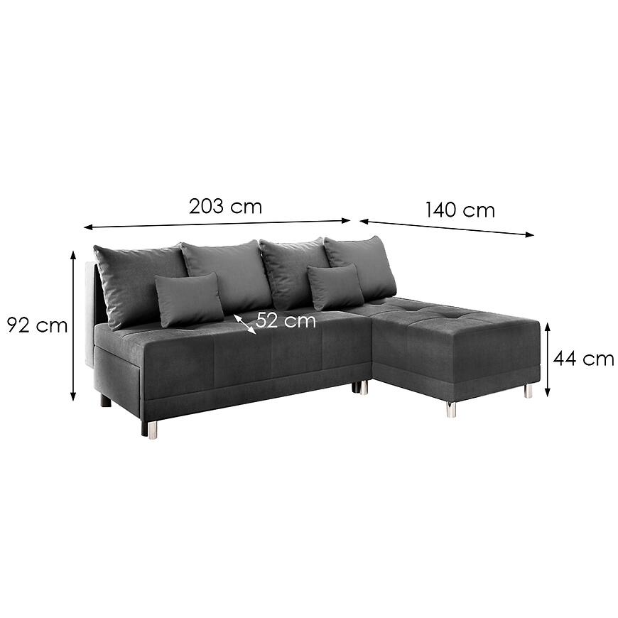 Narożnik Max New Vena 18 szary to niewielki, nowoczesny narożnik w kształcie litery L, idealny do mniejszych mieszkań. Ma wysokość siedziska 44 cm i głębokość 52 cm, co zapewnia komfort podczas siedzenia. Wyposażony jest w funkcję spania o powierzchni 125×203 cm oraz pojemnik na pościel, co czyni go praktycznym rozwiązaniem dla gości. Tapicerka z trwałej szarej tkaniny została ozdobiona nowoczesnymi przeszyciami na siedzisku. Solidne, chromowane nóżki dodają elegancji, a dołączone poduszki zwiększają wygodę. Wymaga samodzielnego montażu.