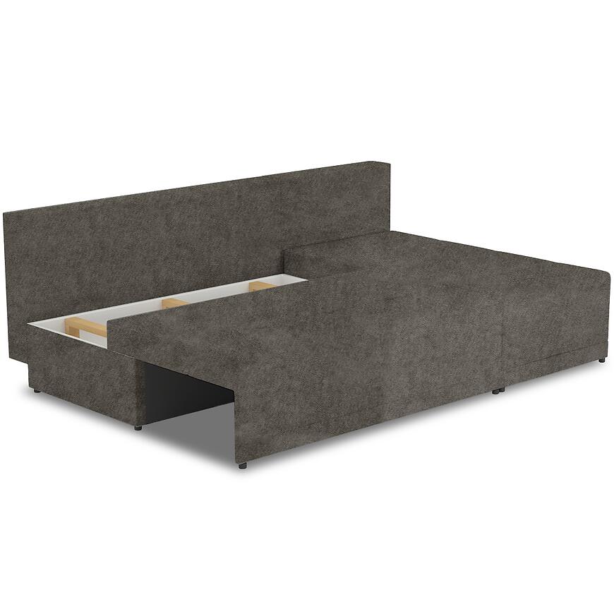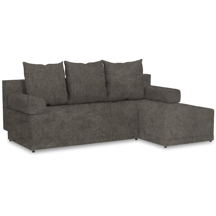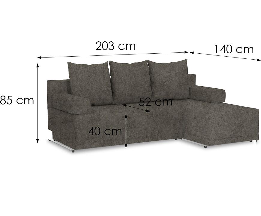 Narożnik Max Whisper 4 uniwersalny to kompaktowy i funkcjonalny narożnik w klasycznym stylu, idealny do mniejszych wnętrz. Ma kształt litery L, wysokość siedziska 40 cm i głębokość 52 cm, co zapewnia wygodę podczas odpoczynku. Wyposażony jest w funkcję spania o powierzchni 203×125 cm oraz pojemnik na pościel, co zwiększa jego praktyczność. Tapicerka z trwałej brązowej tkaniny i wypełnienie z pianki zapewniają komfort użytkowania. Solidne czarne nóżki i dołączone poduszki uzupełniają elegancki wygląd mebla.
