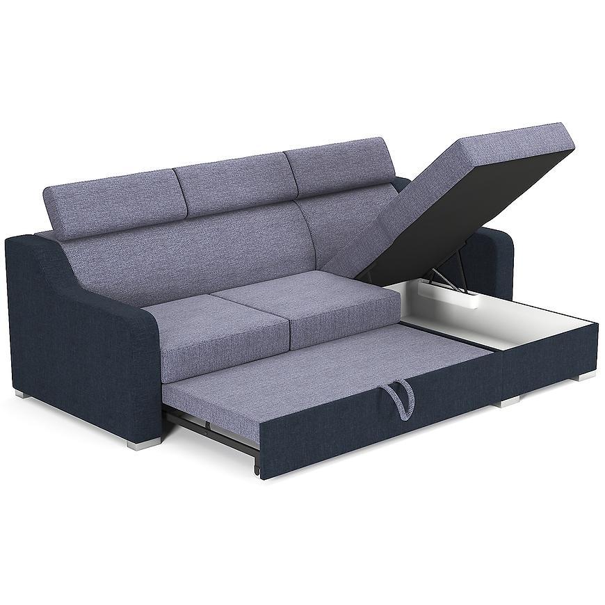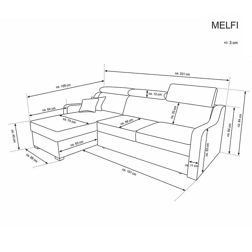 Narożnik rozkładany z serii Melfi Sawana to mebel wypoczynkowy, który będzie szykowną ozdobą salonu lub pokoju dziennego. Niewielkie nóżki spełniają rolę estetycznego wykończenia mebla, a poduszki oparciowe są odpowiedzialne nie tylko za wyjątkową wygodę korzystania z kanapy, ale sprawiają również, że całość prezentuje się atrakcyjnie. Siedzisko zostało wyposażone w elastyczne sprężyny faliste, które odpowiadają za wysoką jakość wypoczynku. Narożnik Melfi Sawana posiada funkcję spania- powierzchnia spania 120x206 cm, co czyni z niego wygodne łóżko. Z kolei sposób rozkładania typu Delfin - jest jednym z najbardziej popularnych systemów rozkładania, który jest wykorzystywany w narożnikach. Polega on na wysunięciu spod siedziska narożnika, wbudowanej tam szuflady i podniesieniu, zamontowanego wewnątrz, stelaża za pomocą uchwytu. Wyposażenie kanapy w praktyczny pojemnik pod siedziskiem umożliwia zaś schowanie pościeli. Dodatkowym atutem są poduszki w komplecie, a nóżki w kolorze satyny zapewnią stabilność. Narożnik dostępny w wersji uniwersalnej.