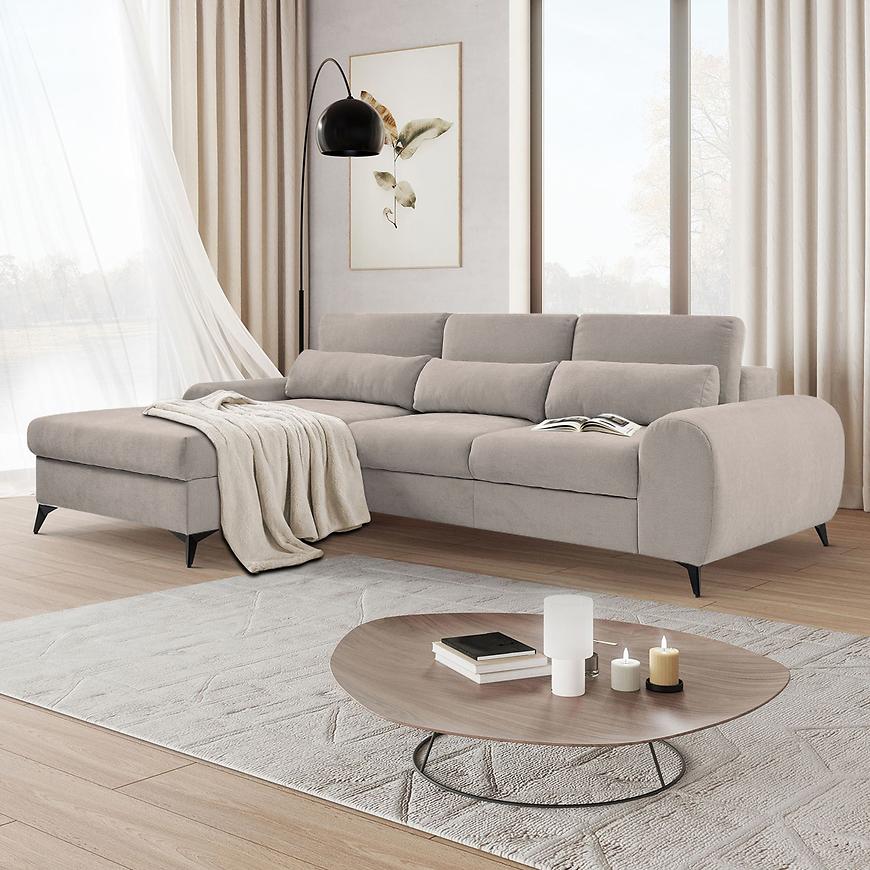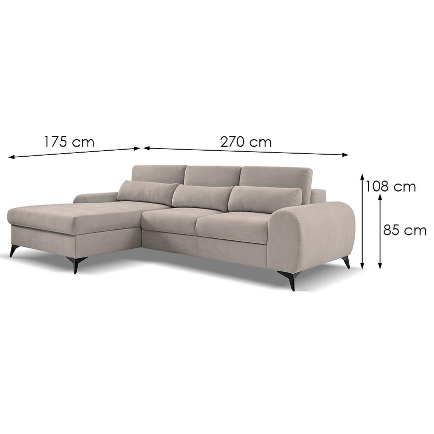 Narożnik Milan L lewostronny w eleganckim beżowym kolorze to funkcjonalny i stylowy mebel wypoczynkowy, idealny do średnich salonów. Tapicerowany wysokiej jakości tkaniną, z siedziskiem wypełnionym sprężyną falistą, zapewnia wygodę i komfort codziennego użytkowania. Wyposażony w funkcję spania o powierzchni 140x215 cm, system rozkładania typu delfin oraz pojemnik na pościel, łączy praktyczność z nowoczesnym designem. Regulowany zagłówek i solidne czarne nogi podkreślają elegancki charakter narożnika. Mebel jest łatwy do złożenia, w komplecie posiada poduszki i stanowi wygodny, estetyczny element wyposażenia wnętrza.