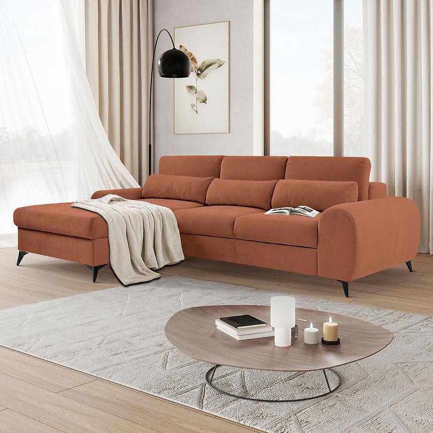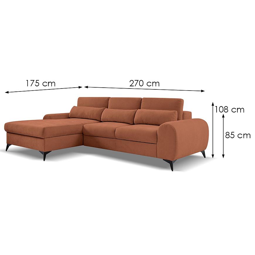 Narożnik Milan L lewostronny w efektownym rudym kolorze to nowoczesny i funkcjonalny mebel wypoczynkowy, idealny do średnich salonów. Tapicerowany wysokiej jakości tkaniną, z siedziskiem wypełnionym sprężyną falistą, zapewnia komfort i wygodę codziennego użytkowania. Wyposażony w funkcję spania o powierzchni 140x215 cm, system rozkładania typu delfin oraz pojemnik na pościel, łączy praktyczność z eleganckim designem. Regulowany zagłówek i solidne czarne nogi podkreślają stylowy charakter narożnika. Mebel jest łatwy do złożenia, w komplecie posiada poduszki i stanowi wygodny oraz estetyczny element wyposażenia wnętrza.