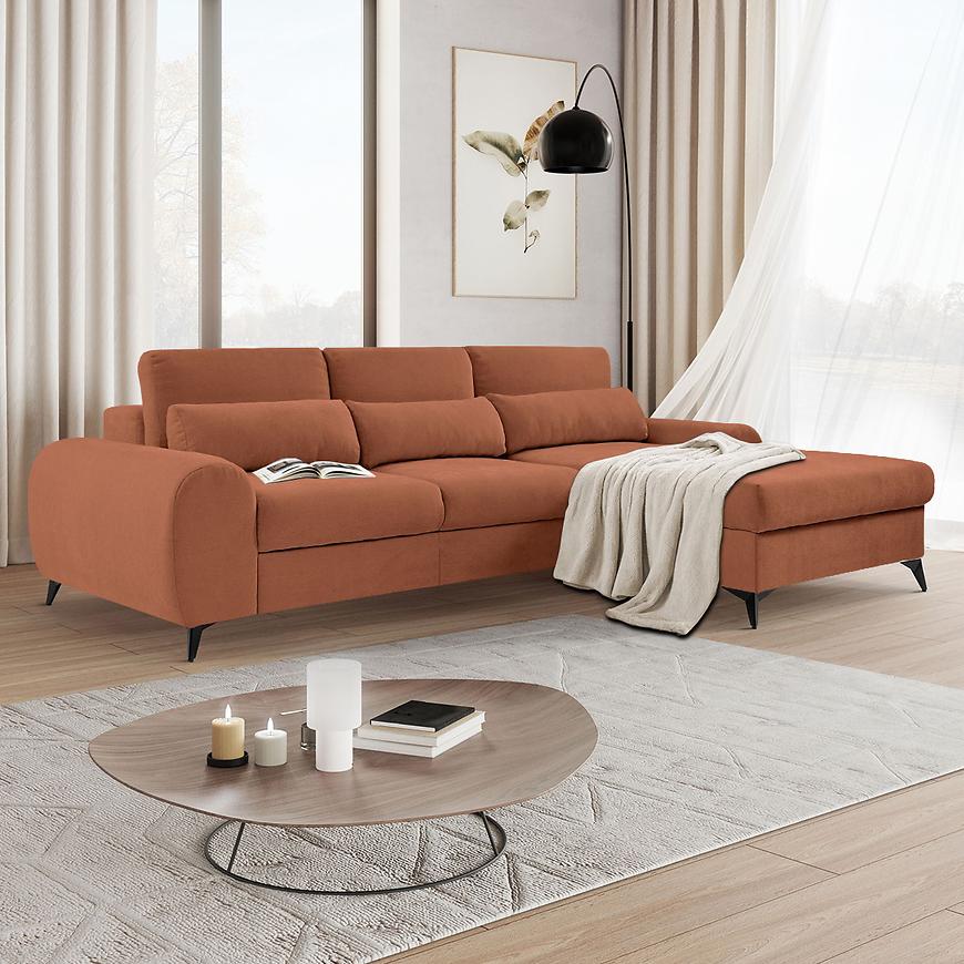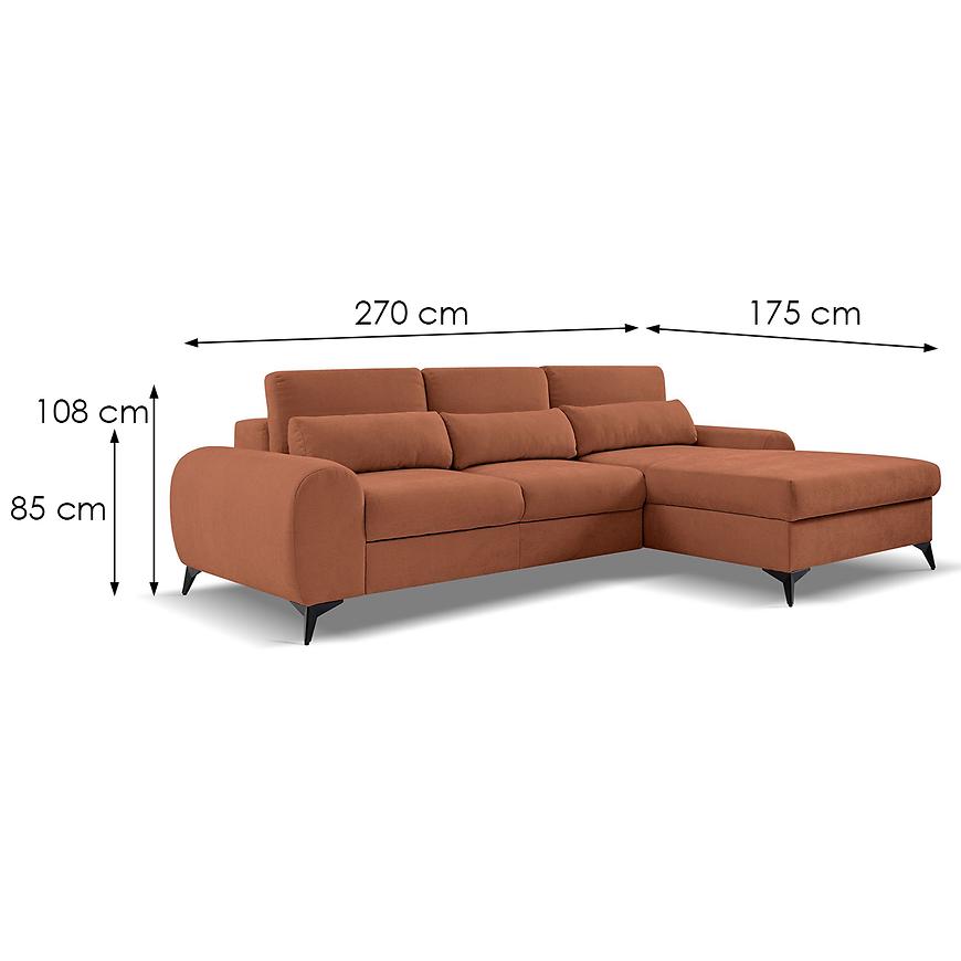 Narożnik Milan L prawostronny w unikatowym rudym kolorze to stylowy i funkcjonalny mebel wypoczynkowy, idealny do średnich salonów. Tapicerowany wysokiej jakości tkaniną, z siedziskiem wypełnionym sprężyną falistą, zapewnia komfort i wygodę codziennego użytkowania. Wyposażony w funkcję spania o powierzchni 140x215 cm, system rozkładania typu delfin oraz pojemnik na pościel, łączy praktyczność z nowoczesnym designem. Regulowany zagłówek i solidne czarne nogi podkreślają elegancki charakter narożnika. Mebel jest łatwy do złożenia, w komplecie posiada poduszki i stanowi wygodny, estetyczny element wyposażenia wnętrza.