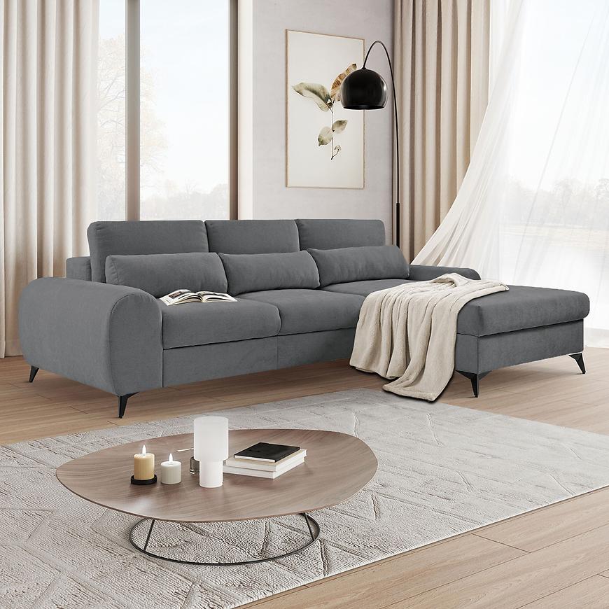 Narożnik Milan L prawostronny w eleganckim szarym kolorze to stylowy i funkcjonalny mebel wypoczynkowy, idealny do średnich salonów. Tapicerowany wysokiej jakości tkaniną, z siedziskiem wypełnionym sprężyną falistą, zapewnia komfort i wygodę codziennego użytkowania. Wyposażony w funkcję spania o powierzchni 140x215 cm, system rozkładania typu delfin oraz pojemnik na pościel, łączy praktyczność z nowoczesnym designem. Regulowany zagłówek i solidne czarne nogi podkreślają elegancki charakter narożnika. Mebel jest łatwy do złożenia, w komplecie posiada poduszki i stanowi wygodny, estetyczny element wyposażenia wnętrza.
