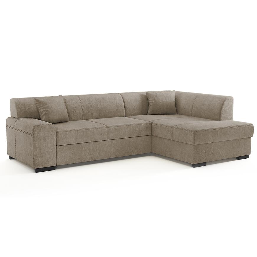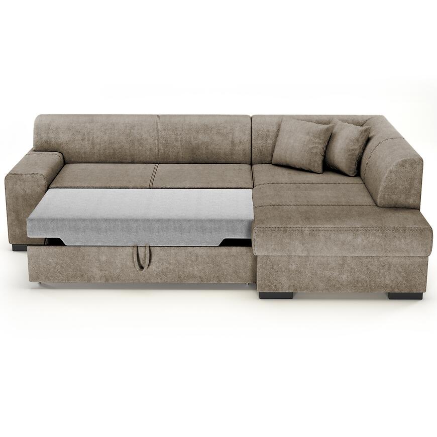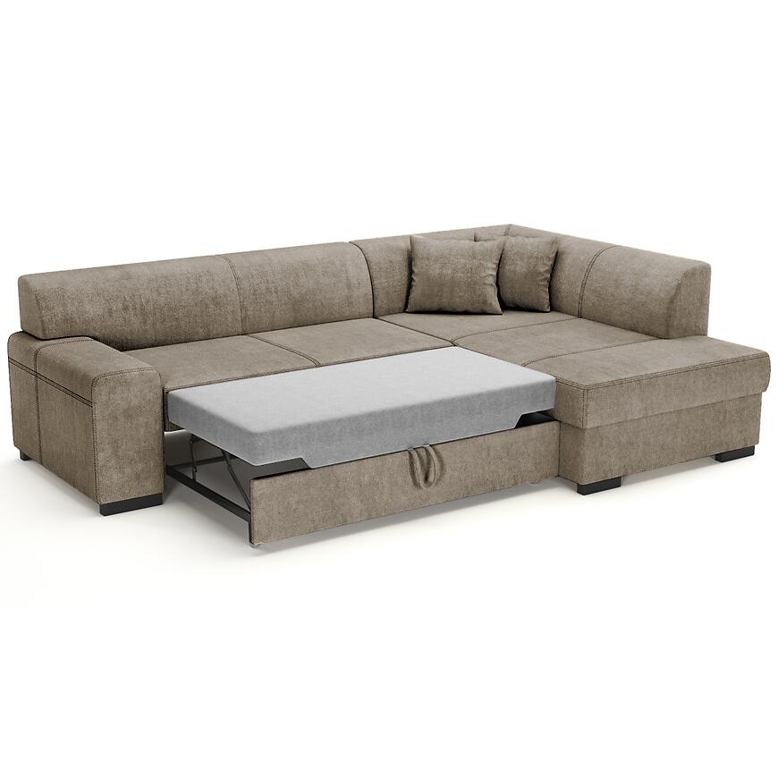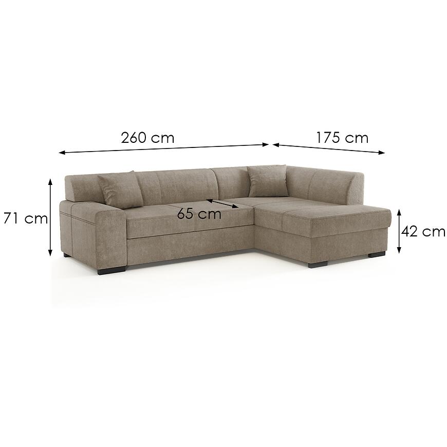 Narożnik Minos P Vogue 4 to klasyczny narożnik w kształcie litery L o wymiarach 260x175x71 cm, łączący elegancję z funkcjonalnością. Wyposażony w funkcję spania o powierzchni 195x135 cm oraz praktyczny pojemnik na pościel, zapewnia wygodę i dodatkowe miejsce do przechowywania. Siedzisko wypełnione sprężyną bonell, tapicerka z trwałej tkaniny w kolorze brązowym oraz stabilne nogi z drewna gwarantują komfort i solidność. Narożnik rozkłada się w sposób delfin i posiada poduszki w zestawie, co czyni go praktycznym i stylowym meblem do klasycznych wnętrz.