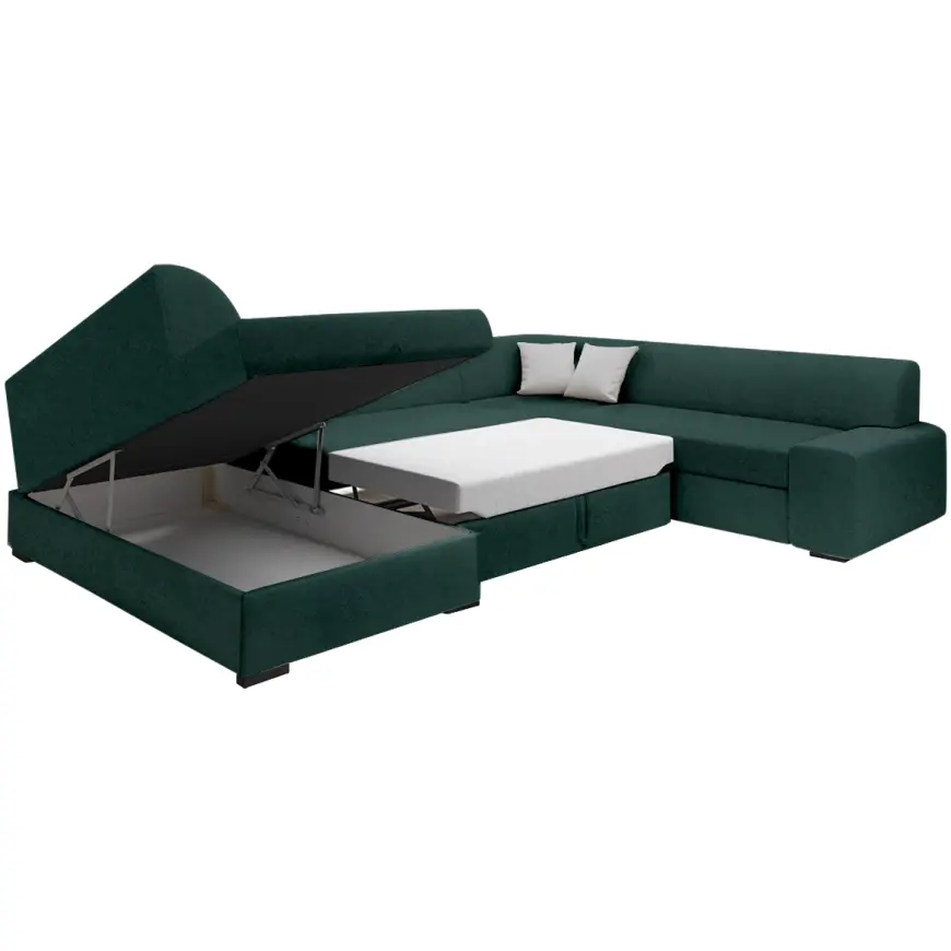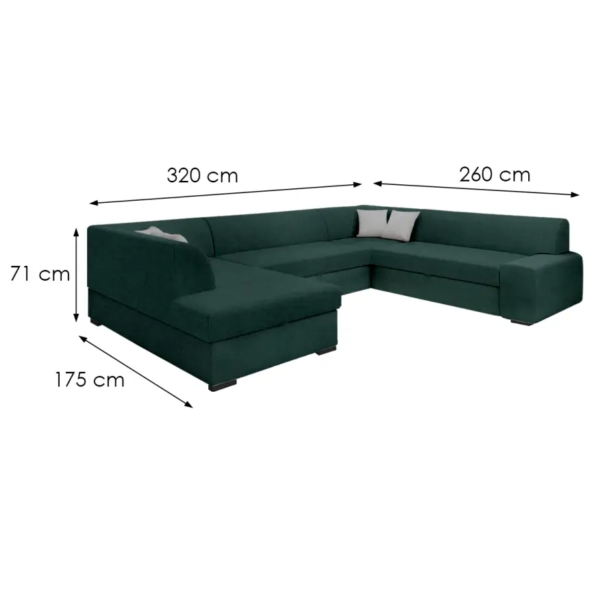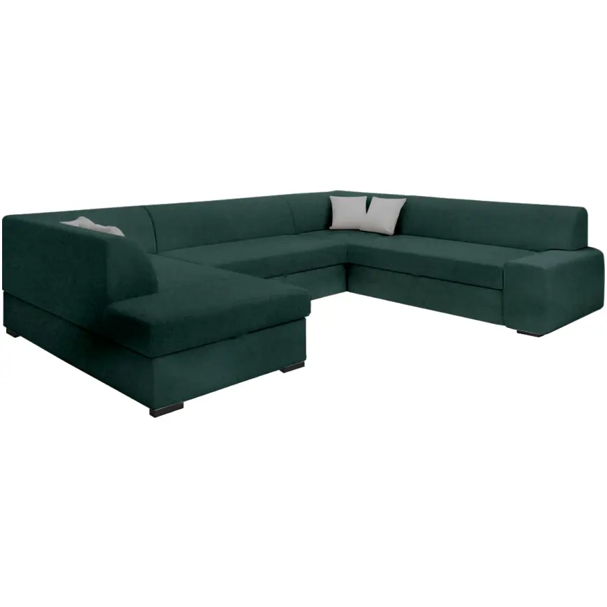 Narożnik Minos U Cloud 37 lewy to przestronny narożnik w klasycznym stylu, w kształcie litery U, łączący funkcjonalność z komfortem. Wyposażony w funkcję spania o powierzchni 135×255 cm oraz dwa pojemniki na pościel, zapewnia praktyczne rozwiązania do przechowywania. Tapicerowany trwałą zieloną tkaniną, z wypełnieniem na sprężynie bonell, gwarantuje wygodę codziennego użytkowania. Stabilne drewniane nóżki podkreślają elegancję, a zestaw uzupełniają dopasowane poduszki dekoracyjne. Solidny wybór dla osób ceniących komfort i styl.