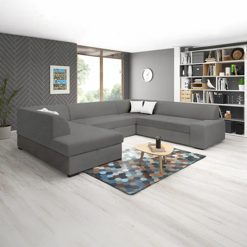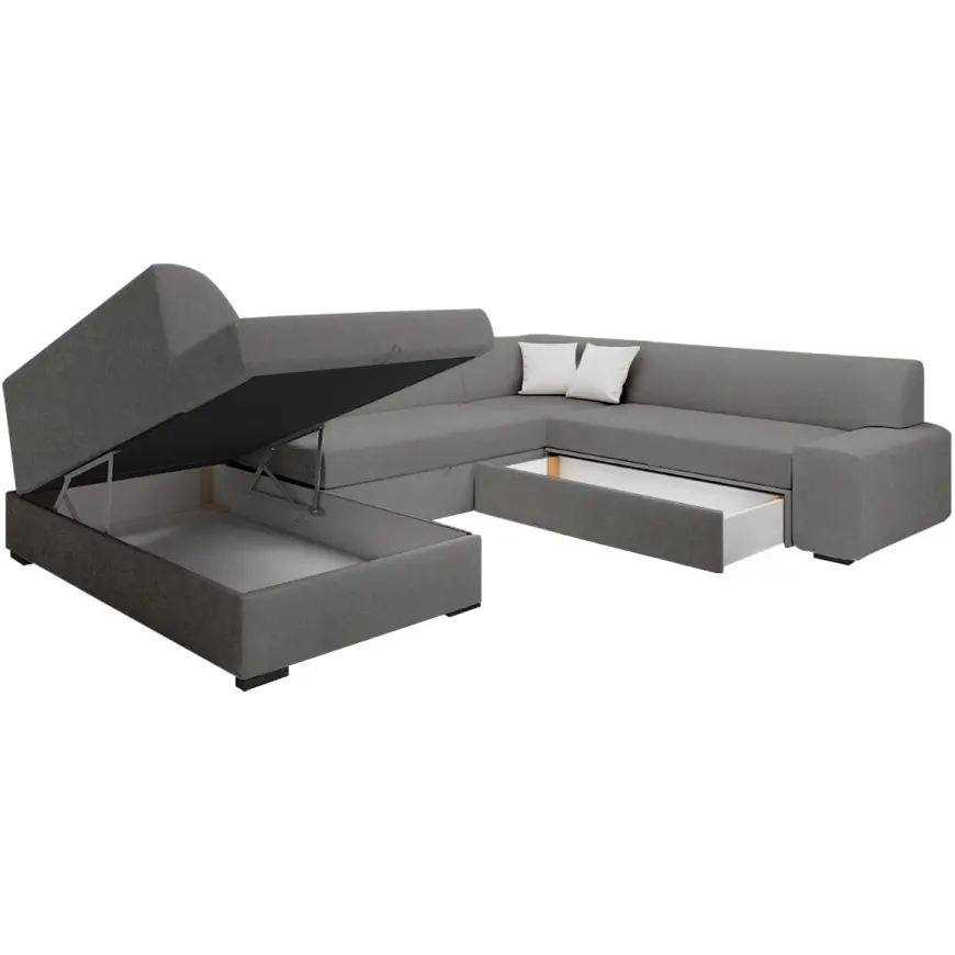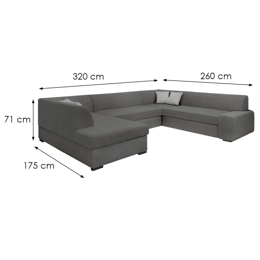 Narożnik Minos U Cloud 91 lewy to przestronny narożnik w klasycznym stylu, w kształcie litery U, łączący komfort i funkcjonalność. Wyposażony w funkcję spania o powierzchni 135×255 cm z mechanizmem delfin oraz dwa pojemniki na pościel, oferuje praktyczne rozwiązania do przechowywania. Tapicerowany trwałą szarą tkaniną, z wypełnieniem na sprężynie bonell, zapewnia wygodę codziennego użytkowania. Stabilne drewniane nóżki dodają elegancji, a zestaw uzupełniają dopasowane poduszki dekoracyjne. Solidny wybór dla osób ceniących komfort i styl.