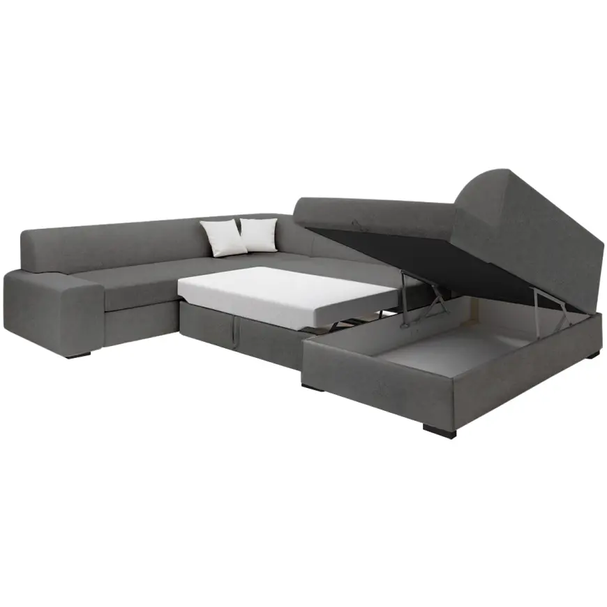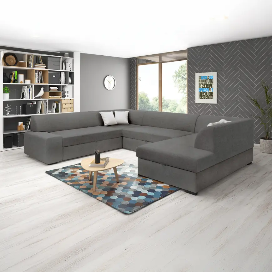 Narożnik Minos U Cloud 91 prawy to przestronny narożnik w klasycznym stylu, w kształcie litery U, łączący wygodę i funkcjonalność. Wyposażony w funkcję spania o powierzchni 135×255 cm z mechanizmem delfin oraz dwa pojemniki na pościel, zapewnia praktyczne przechowywanie. Tapicerowany trwałą szarą tkaniną, z wypełnieniem na sprężynie bonell, gwarantuje komfort codziennego użytkowania. Stabilne drewniane nóżki podkreślają elegancję, a zestaw uzupełniają dopasowane poduszki dekoracyjne. Solidny wybór dla osób ceniących komfort i styl.